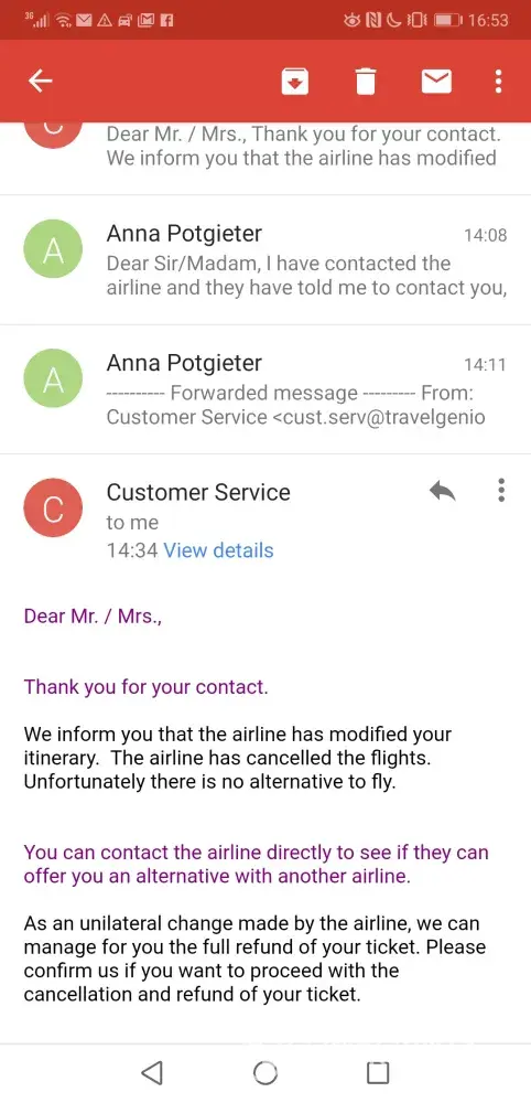 Contacted TravelGenio on (07/04/2019), they responded on (21/04/2019)