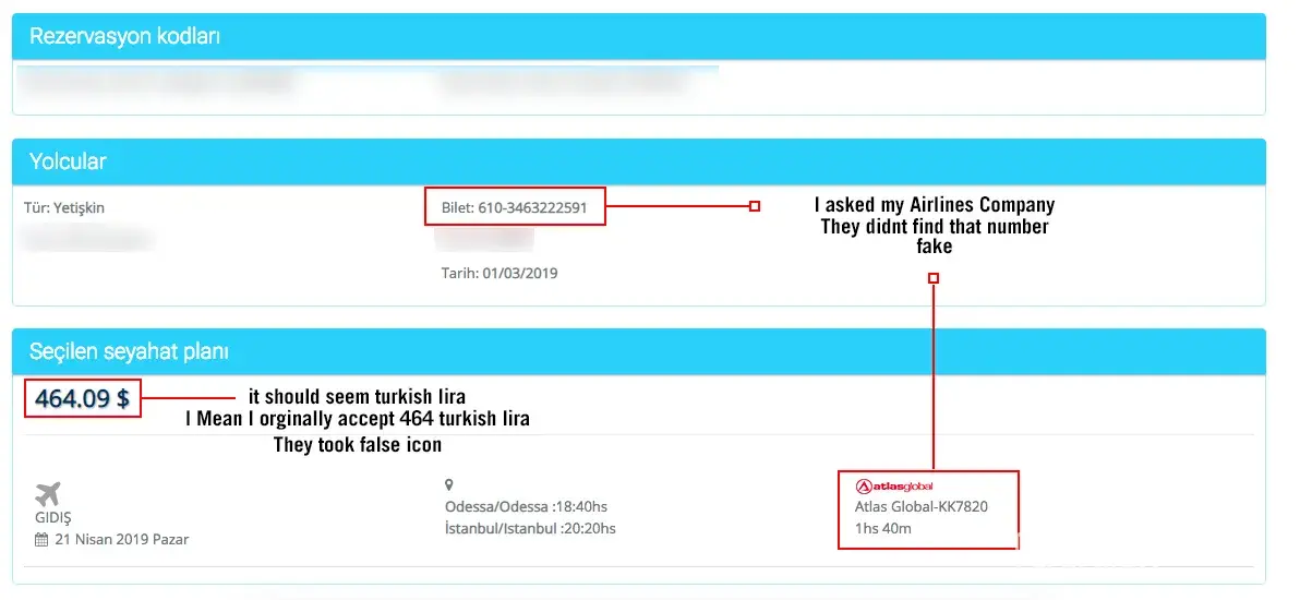 while I complete my ticket from travelgenio web page, it did not send 3D security number and wait almost 10 minute to complete but Travelgenio web page did not said ''you completed'' and travelgenio page didn't send me any e-mail during to one hour. Therefore I bought same ticket from other web page(ucuzabilet.com) and it's done clear. Travelgenio send me e-mail for ticket After that I called Airlines Company (Atlas Global) said to me same time and same person impossible to have reservation I asked for search their(travelgenio) ticket number from the airlines company and they said to me this is ''no such number'' and I called spain Travelgenio office told me okey we can cancel but you have to pay 30 euro for service. I suddenly called to solve the problem but they already bloked my ticket price on my bank acoount I realize that. it's like 2 time paid for ticket. one of them is real it's clear, otherone(travelgenio) took me fake number ticket.