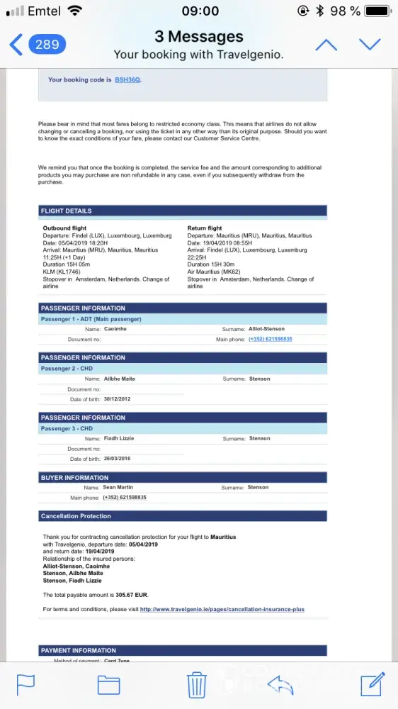 I booked flights on 18 June 2019 for travel for three people Lux-Amsterdam-Mauritius return. Unable to check-in online. Got to airport and denied boarding (put on stand-by as though as reservation existed it had not been processed properly and our seats not reserved). Missed our connecting flight. KLM put us on new flights from Paris nevertheless but same thing happened on way back and this time airline refused to help. They checked on Amadeus and our reservation had actually been voided on 19 June 2019. Travelgenio refuses to acknowledge this. I was travelling alone with 3 and 6 year old daughters, had to pay 2500 for new flights home, 800 euro in phone bill, and 3 days's extra accommodation, car rental and expenses, plus cost of travelling to and from Paris. I am currently about 4, 000 euro out of pocket.