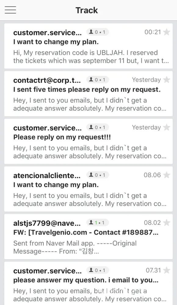 Excuse me. I already sent you emails when you said this address ‘customer.service@travelgenio.com’ and others. So i attach a photo that you DIDN’T READ mails in my sent mail especially track.