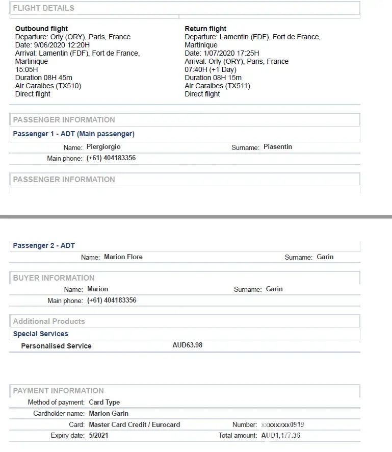 In January 2020 we booked 2 return tickets Paris - Fort de France on Travelgenio booking platform for a trip from 09/06/20 to 01/07/20, with the airline Air Caraibes (see flight details attachment). With the international COVID situation we were not able to leave our country of origin, Australia, and reached out to Travelgenio to start the refund process.