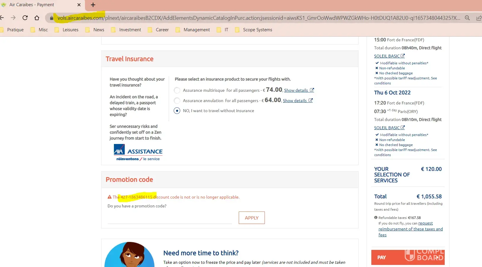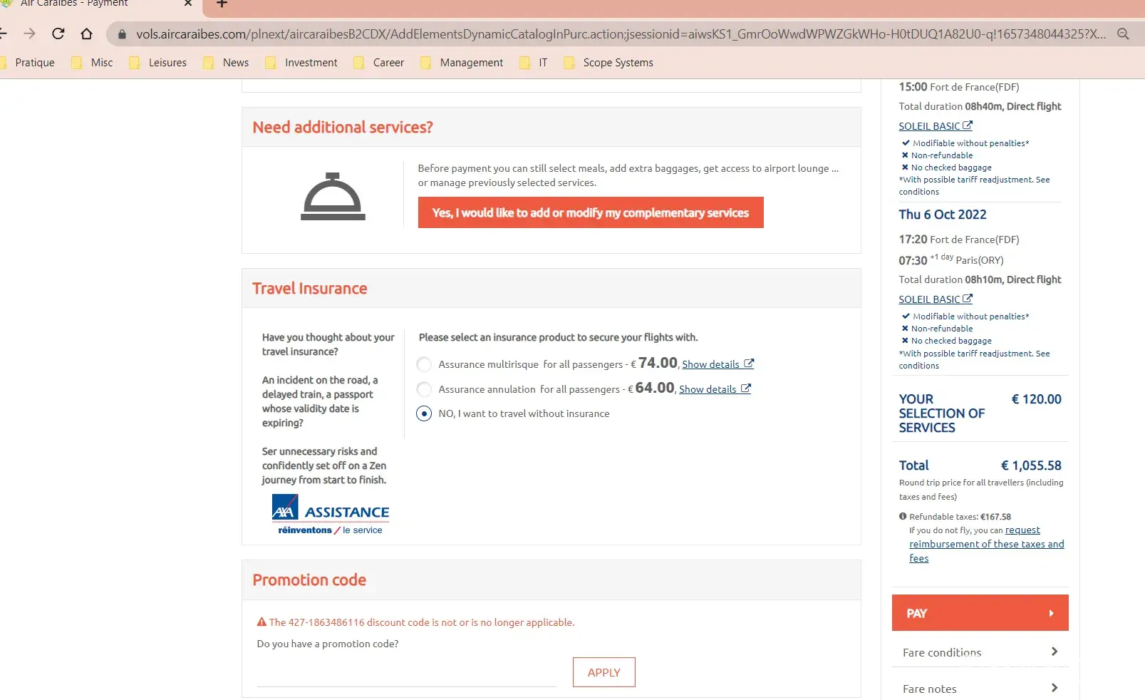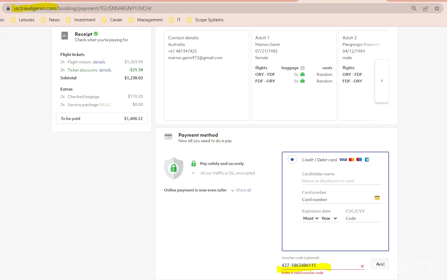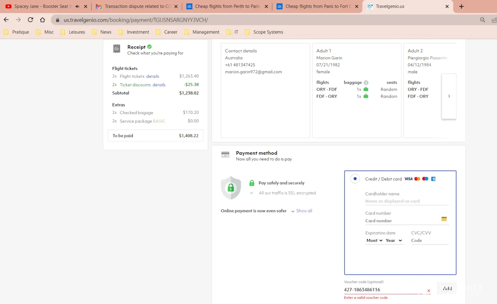 Two years later, in July 2022, as we finally could fly internationally, we tried to use the vouchers on Air Caraibes website. When entering the vouchers codes provided it says it is invalid, for both of them (see air caraibes code 115 and 116 attachments). When trying to lodge a refund claim to Air Caraibes it requires a booking number with them, which we don't have as we booked with Travelgenio. We even tried to use on Travelgenio website, with no success (see travelgenio codes 115 and 116 attachments).