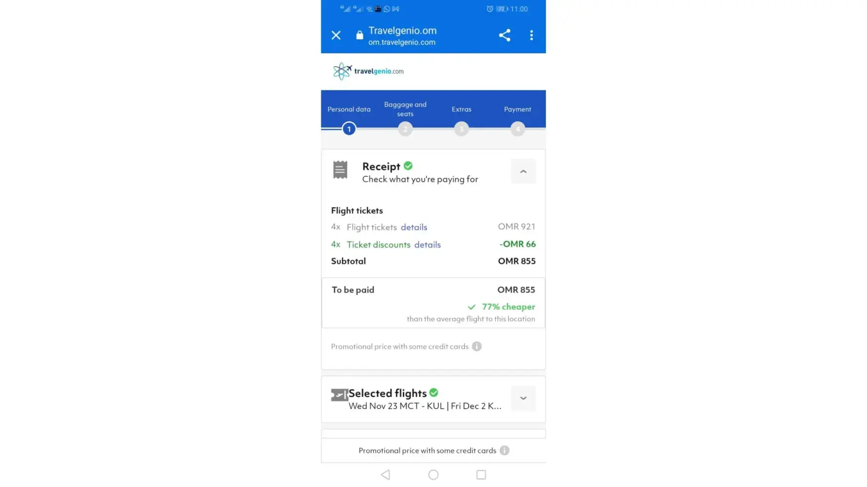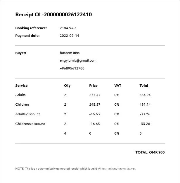 As per attached photos in the mail the cost of 4 tickets from muscat to kuala lampor as shown should be (921 omr - 66 omr as discount from your website), and the total amount to be paid is 855 omr net. While the amount was deduced from my account as per 2nd shared receipt is 980 omr, which means that there's over 130 omr (337.6 $) over charged,