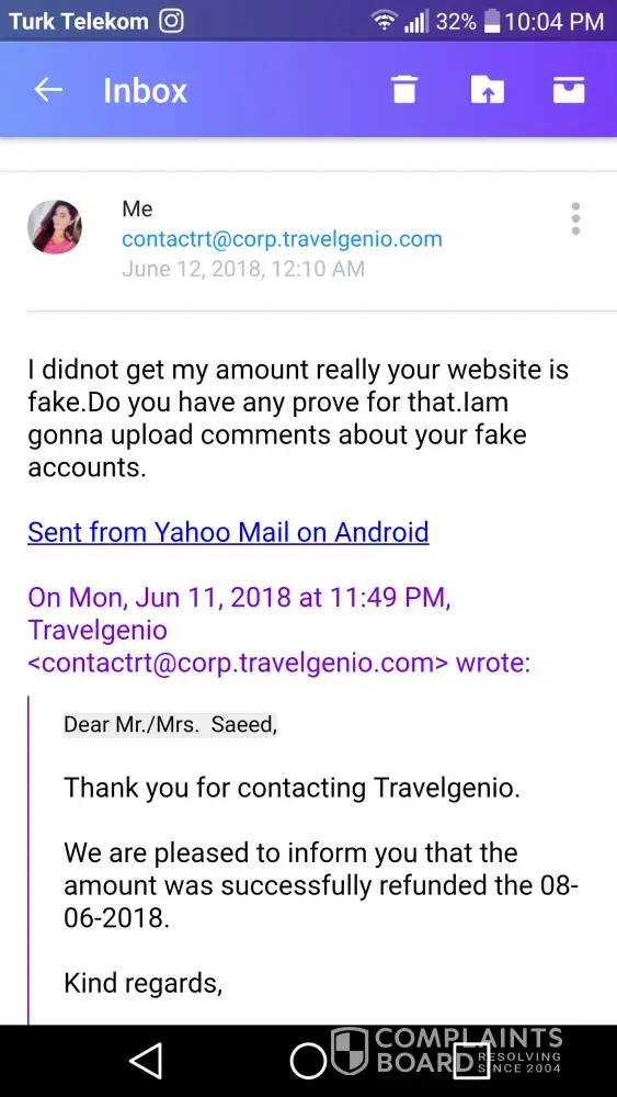 If you receive a reply mail from Travelgenio, you should check their reply email address.