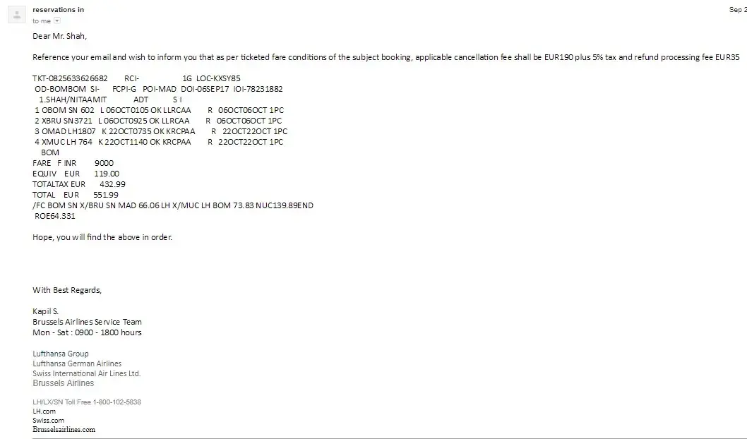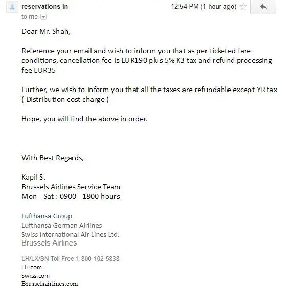 Brussels airlines claim only penalty of 190 euros plus service charge and YR tax would be deducted and balance 320 euros has been refunded to Travelgenio. On being asked for email certificate they sent an email with all details and amount to be refunded.