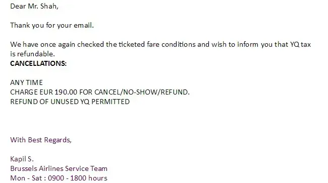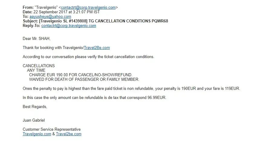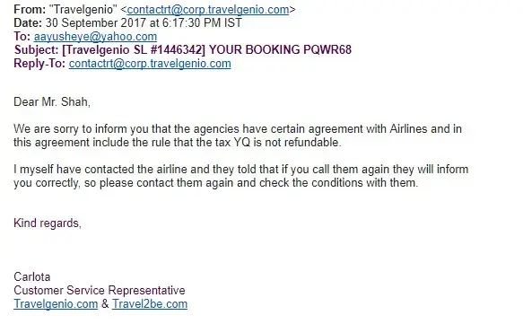 After this I spoke to the airline again (this is the eight time). The airline again said that there is no such agreement with Travelgenio or any other travel agent that the YQ tax is not refundable. They have always shared email proof of the refund charges and ticket rules. They said that the money has already been refunded to the travel agent and to contact them for the refund.
