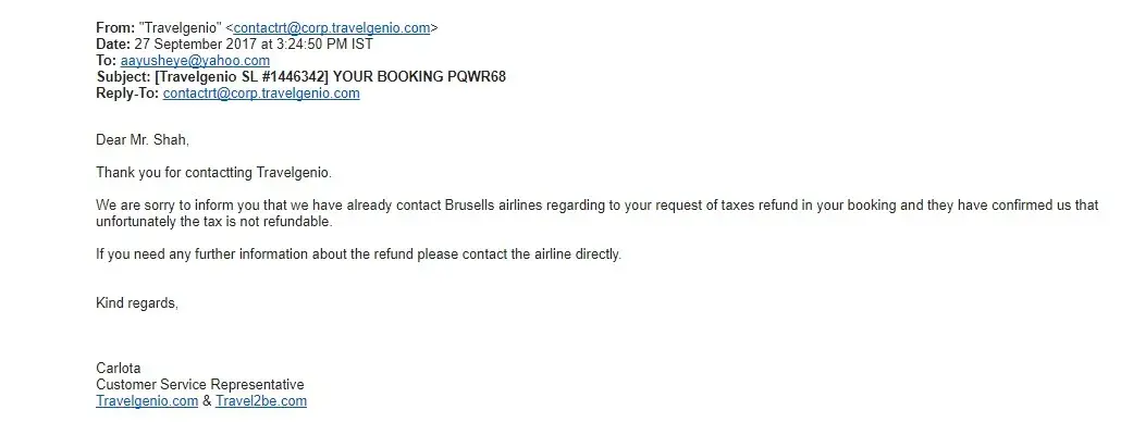 After forwarding this email not once but twice to Travelgenio still have not received a response or refund or proof saying airline has refused to refund taxes.