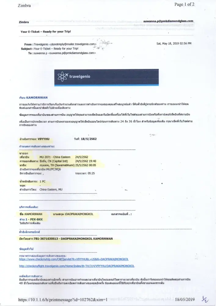 airline ticket purchased from travelgenio.com