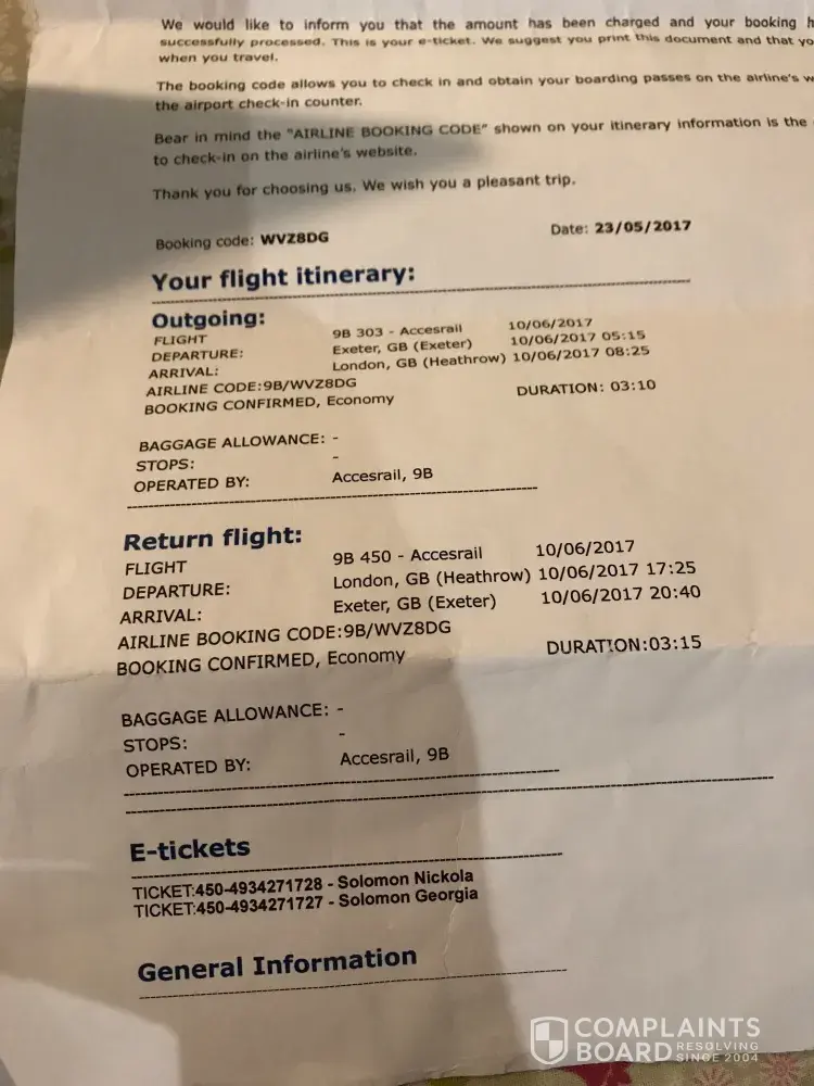 Travelgenio I booked 2 return flights from exeter to heathrow for sat 10th june 2017. the flights didn't exist and were apparently a train ticket.