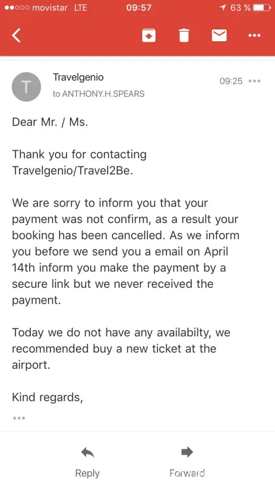 I just wanted to bring to your attention that as I arrived at the airport today and checked in, I was denied my flight. Upon calling (and getting disconnected and then eventually being connected to an employee who's english was impeding what I was trying to convey) I learned that I apparently never "paid" for the flight. I want to fully acknowledge that I did not indeed pay for the flight, but it was due to a highly misleading "confirmation email" that I had received from travelgenio.