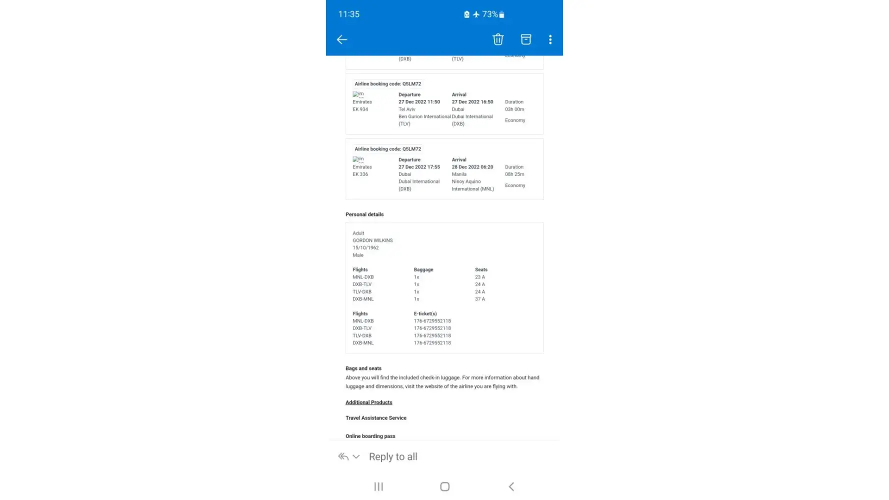 I am enquiring as to why Emirates Airlines had no record of my payment of 16751 pesos for allocated seating. I therefore was not able to travel on any of the four pre-assigned seats that I had paid your agency for. (Refer attachments)