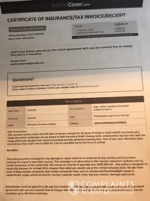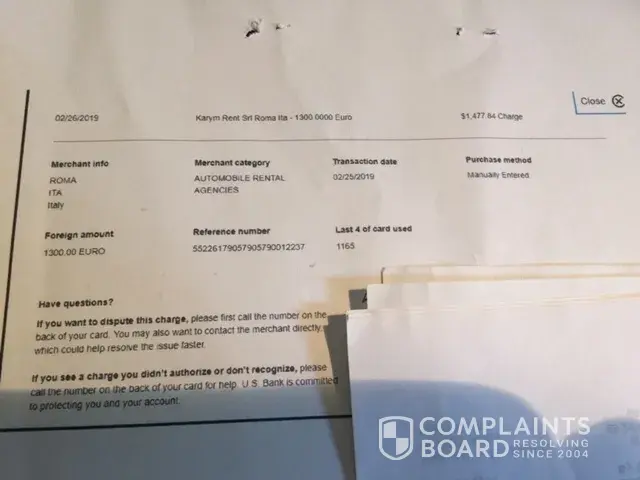 I rented a vehicle from Karym Rental from 22/02/2019 to 25/02/2019 Business VAT [protected] acct#1108905 Confimation #1852618. I turned the vehicle in and showed the employees the tire/wheel that I had scraped against a curb. I told them that I have purchased coverage from RentalCover.com and they waived me on and said don't worry about it. I was in error by not staying and getting a final receipt. I assumed that they would email me a receipt or get in touch with me if there was a problem. I received my credit car statement and they had charged me 1300 euros or $1477.84 on my credit card. Also this charge was placed on 26/02/2019, there was not enough time to get estimate and repairs by the day after I returned the vehicle. How could they know what the charges would be? I immediately tried to get this settled and could not get in touch with Karym. The person who answered the phone (Gabriel) said that they would credit it back that it was just an oversight but when I asked if I could talk to the office he said they didn't have a phone # but I could email Decno. service@email. it. That email was never answered. I emailed Rentalcars.com and Sammy R. said he would get in touch with Karym and get it worked out. April 4th was my last communication with them. I put in a claim to RentalCover.com policy#COLVY79VP87A Ref# BAT2-JAP1-INS because I then assumed it could have been the tire/wheel scrape. RentalCover said I needed a copy of the estimate and show proof of repair. That was what Sammy R was going to get and now nice Ms. Melissa B. from RentalCover.com is trying to help me but nothing is happening. I have a photo of the damage to the tire/wheel and that is all of the damage to the vehicle if anything else is added that is fraudulent. I also had the car on full when I dropped it off. I cannot believe a scrape on a tire/wheel cover would cost so much. But either way I had bought the coverage and that should be covered. This has been a very frustrating and a painful struggle for my nerves. I believe they are trying to see if I will give up and not pursue this. What was a wonderful trip to Italy has become a real nightmare. I did not authorize or have any notification of this money being charged to my credit card. This is illegal. I have been cooperative and patient. Please help me with this!
