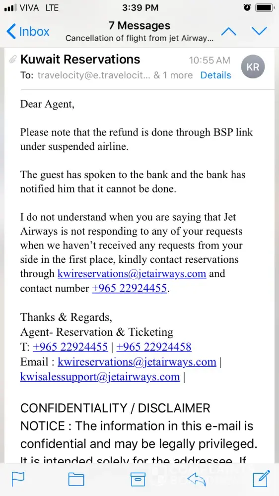 Each time constant reply stating contact bank for dispute or jet airways is not responding. Jet airways kuwait is responding to email and telephone.