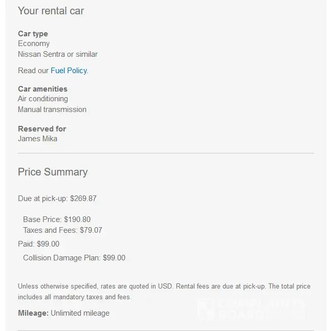 Desired outcome: Please refund for rental car. fuel it used and 2 round trip vocuhers for future domestic travel..