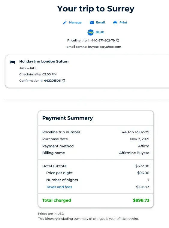 In my browser, I saw a message reading "Thank you! Your trip is booked.l Travelocity itinerary number [protected]. You'll receive a confirmation email shortly at [protected]@gmail.com."