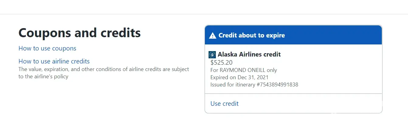 Desired outcome: Refund my $525.20 For RAYMOND ONEILL only Expired on Dec 31, 2021 Issued for itinerary #[protected]