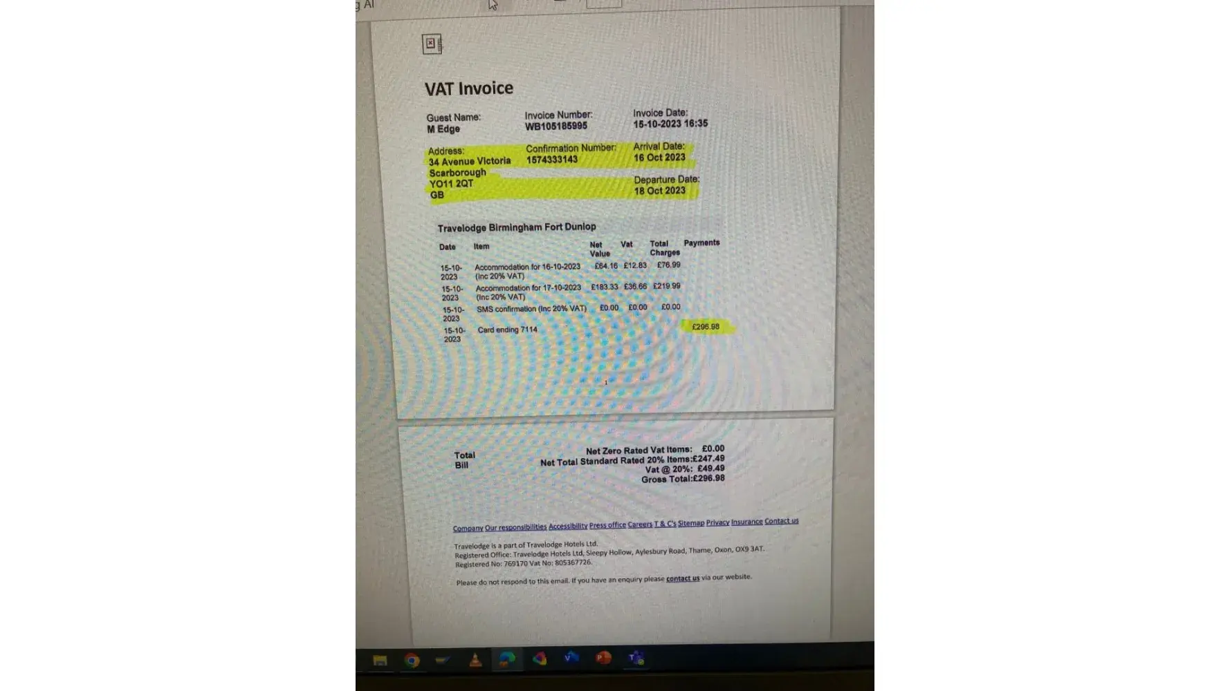 Saying this, I stayed in the Fort Dunlop Travelodge for 2 nights on the 16th and 17th October. I was charged £76.99 for the first night and £219.99 for the second night