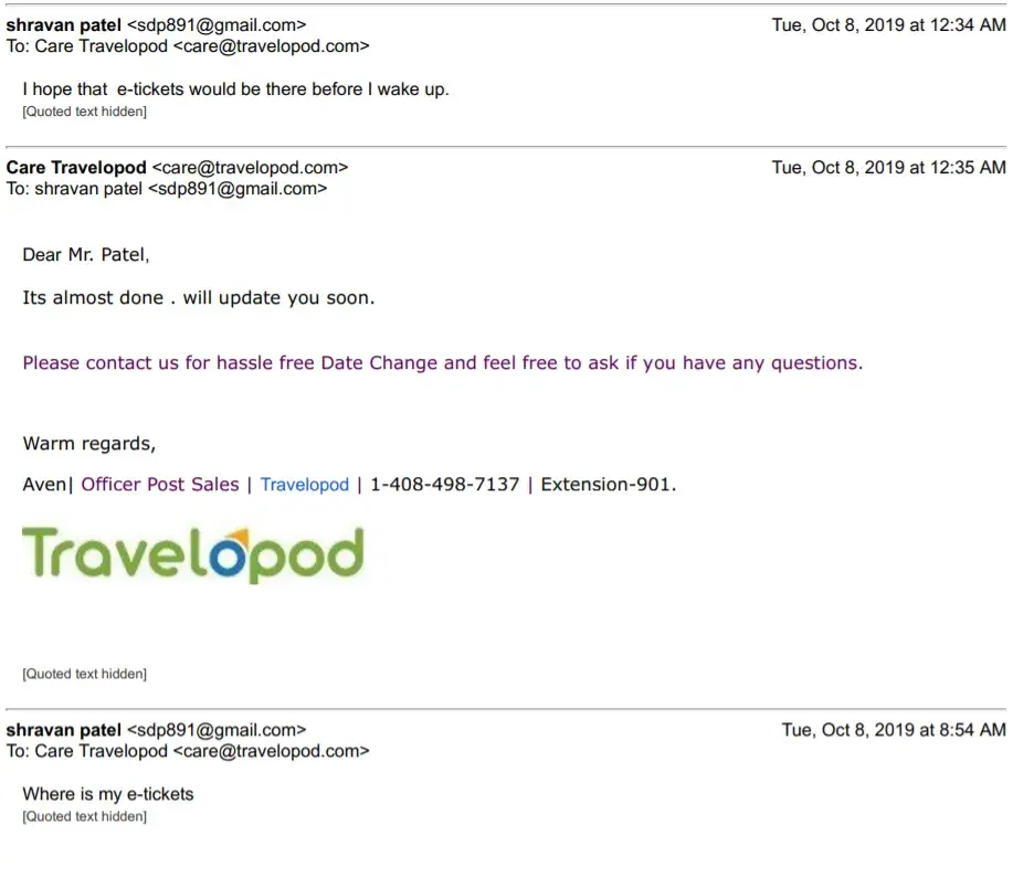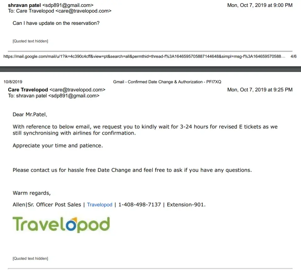 I had two tickets reserved for Nov 18th 2019. However, due to medical emergency passengers needs to travel asap. I have been contacting travelopod concern department to make changes of date. Every different agent is giving different dates within a week time period without providing any conformation. Now They want us to travel on Oct 10th 2019, it is Oct 9th in India. How can they travel internationally within 24 hours without having confirmed tickets. Every single agent telling us different story, basically all of them are lying. Every time I call them, they are giving me two hours of time for conformation since 5 days. You need to hire professional people. It's seems like business is operating from house. I need to resolve this issue asap on top priority.