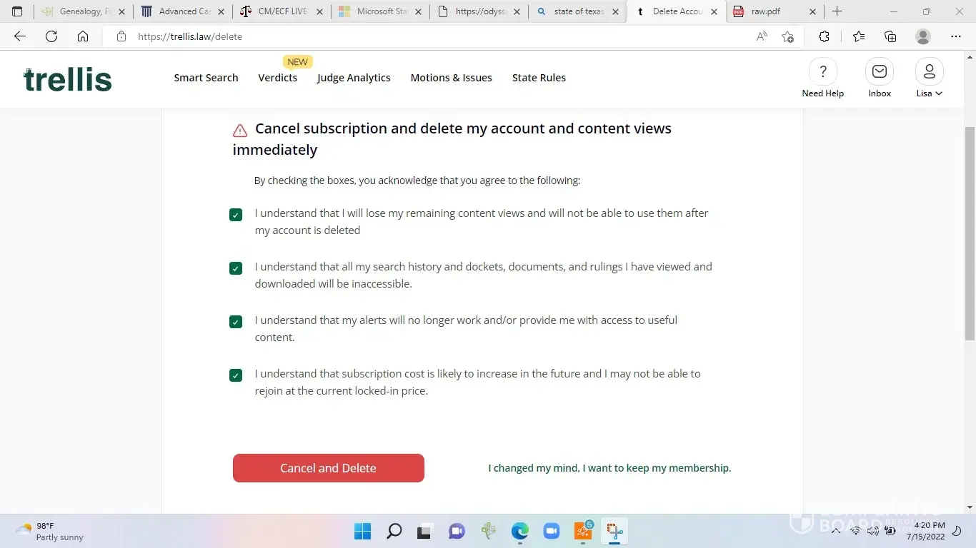 I started a 14 day trial subscription to Trellis Legal Research on July 4, 2022. In setting up the trial period I provided a credit card for payment IF I kept the service beyond the 14 day trial.