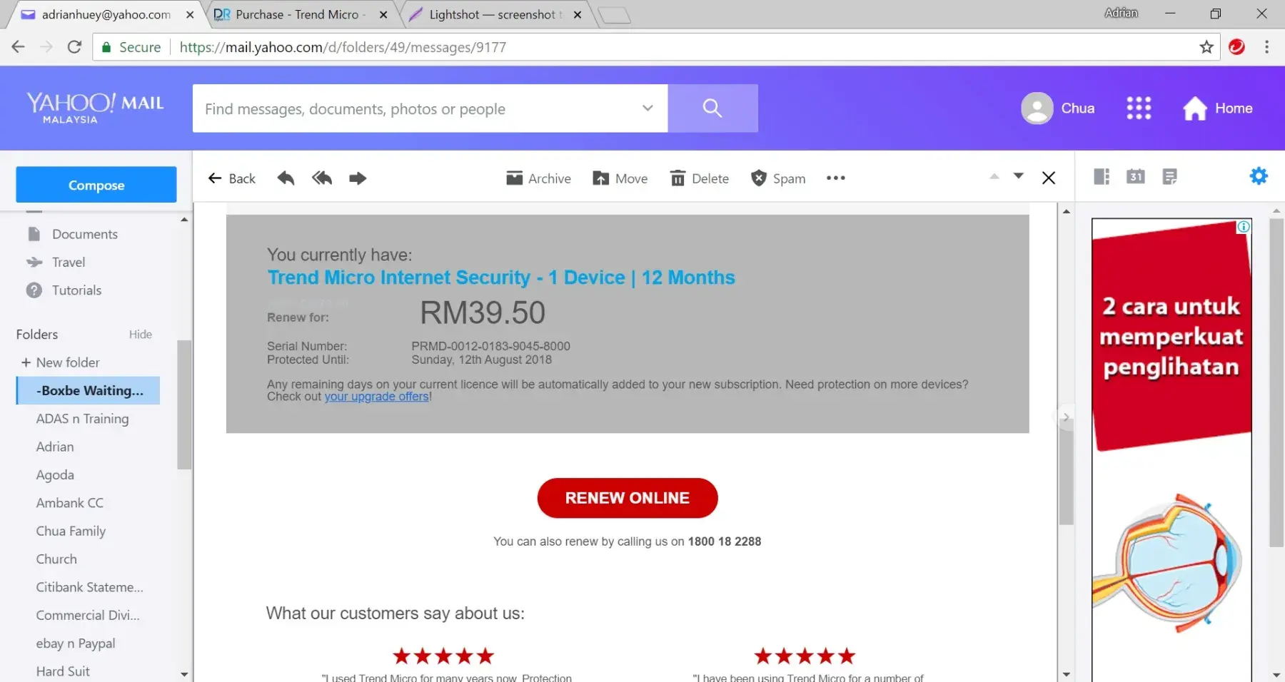 I just renew my internet security for 12 month with rm59.00 on 12 aug 2018. I have 2 issue that I very unsatisfying with your product information and website for renewal.