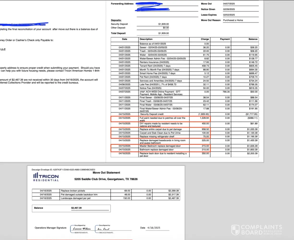 Tricon Residential is exploiting low-income and marginalized individuals through their property management practices. Throughout my years of renting, which span from my time in the military to my retirement, I have never been billed for painting an entire house. The number of additional fees is unprecedented, and I suspect they might be reusing photographs from previous tenants or deliberately creating disarray during the final inspection to rationalize the excessive charges. I strongly advise keeping a distance from this company.