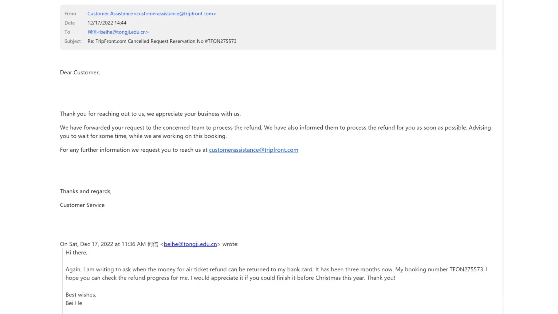 In response, customerassistance@tripfront.com sent me an email, on the same day (December 24th 2022) stating that “ Dear Customer, Thank you for reaching out to us, we appreciate your business with us. As we have checked the refund is showing under processing. We advise you to wait for few days more while refund is getting processed. For any further information we request you to reach us at