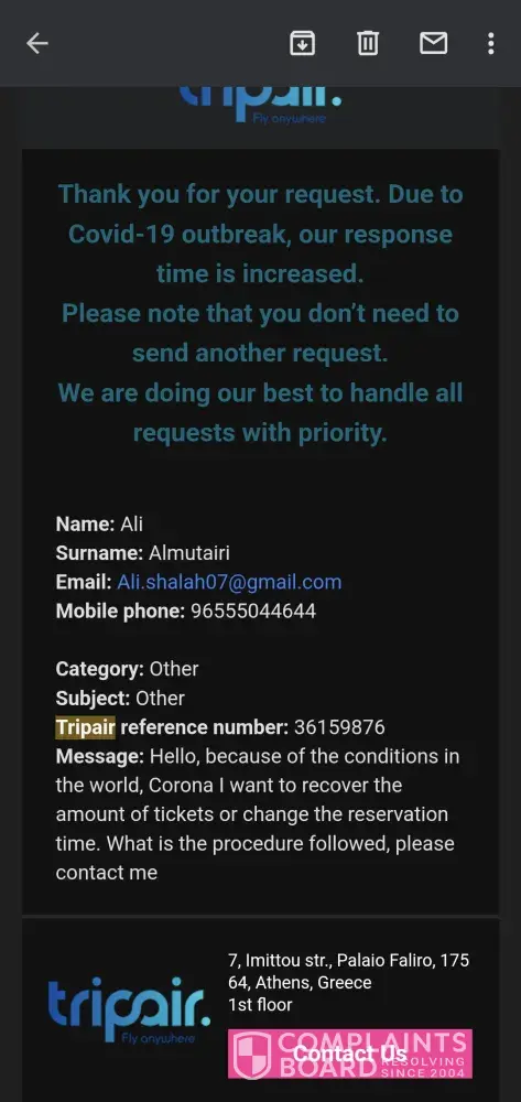 Can't reach Tripair by any means; they don't respond to emails and phone lines are cut, nobody picks up, some numbers they have don't even ring. I also have a refund application number: [protected]. They said earlier that the refund would take around 6 months. It has been like a year and still nothing, even though they got the money back from carrier a lot before.