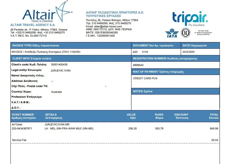 On the 24th of February, I booked a return flight from Melbourne, Australia to Warsaw, Poland. My departure flight from Melbourne was scheduled for the 3rd of April, 2020 with the return flight from Warsaw on the 8th of May, 2020. Please see the flight references below or refer to the attached invoice: