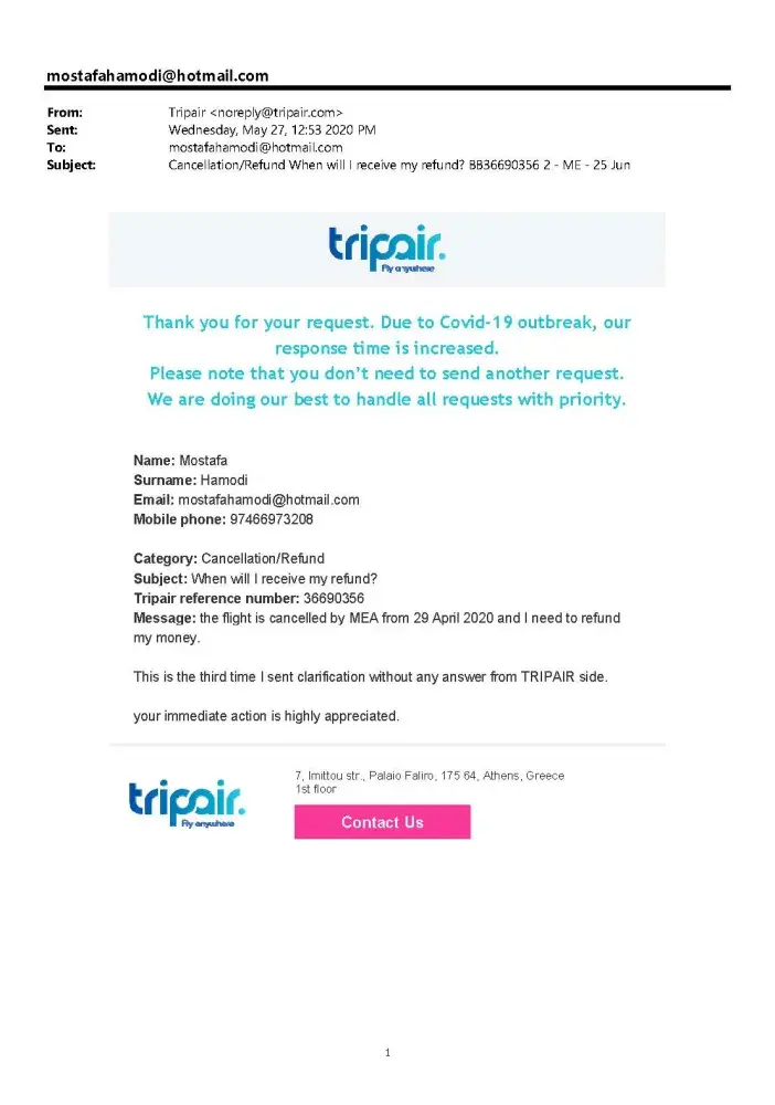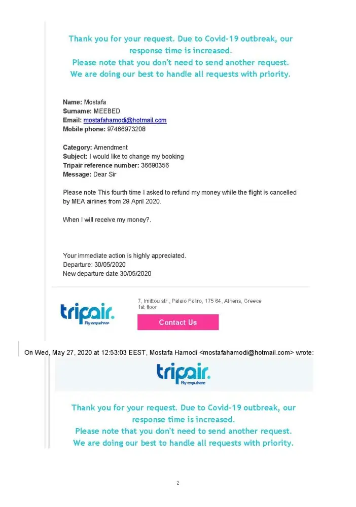I bought two tickets via tripair. My flights were cancelled because of Corona. More than 4 months I have been trying to contact tripair to transfer my money back. They have not answered any of my emails. The line all the time busy. Sometimes I call them more than 40 times per day but all the time the line is busy. I really started to go to the court to complain about tripair.