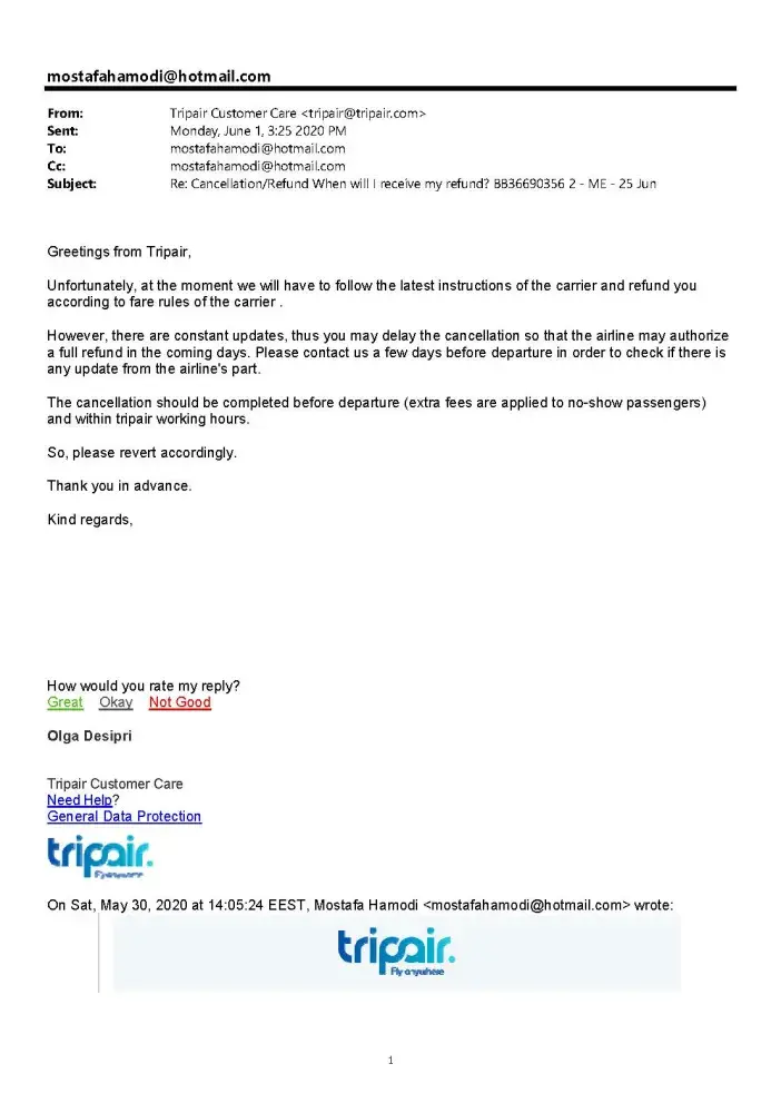I've been writing more than 5 emails to [protected]@tripair.com to follow up my refund status. It supposed to be settled in April 2020. However, the customer service totally ignored my emails and didn't reply to me feedback submitted online. I'm totally disappointment with the service provided by tripair. I will never book via tripair again! !