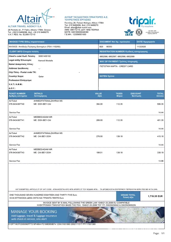 Charge from Altair Travel S.A. (Tripair) AED 1265, 47