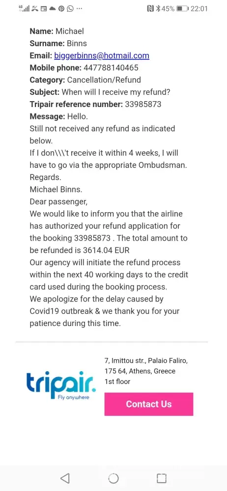 I have received several emails from Tripair stating my refund has been authorised and should be with me in several weeks, but it still has not materialised!