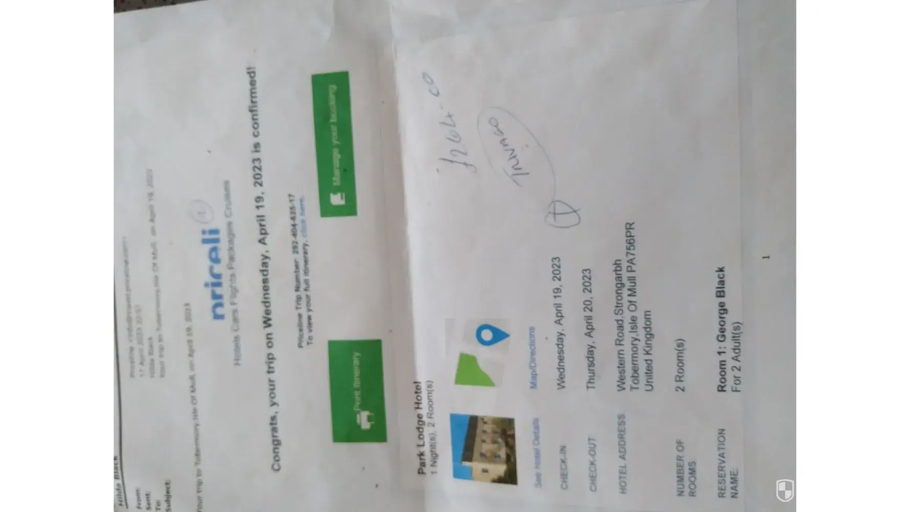 Booked 2 rooms for 2 men through Trivago. Took the cheapest which was Price Line. Had to do a chat to get confirmation & took ages. When 2 men arrived at the hotel in Tobermory there was only 1 room instead if 2 rooms which was stated on confirmation for 2 men. Price Line for some reason on chat said to contact booking. Com. I knew that was wrong. Got back in touch with Trivago who now told me to email Agoda. They say they have no trace if my email address or booking. I require 50% back as only 1 man got accommodation. I have went round in circles and no-one taking the blame. I will not give up. Its bad enough what's happened, but after a hard day's work, it wasn't very nice to be told there was only 1 room & not 2 which was paid for! WANT MY MONEY BACK