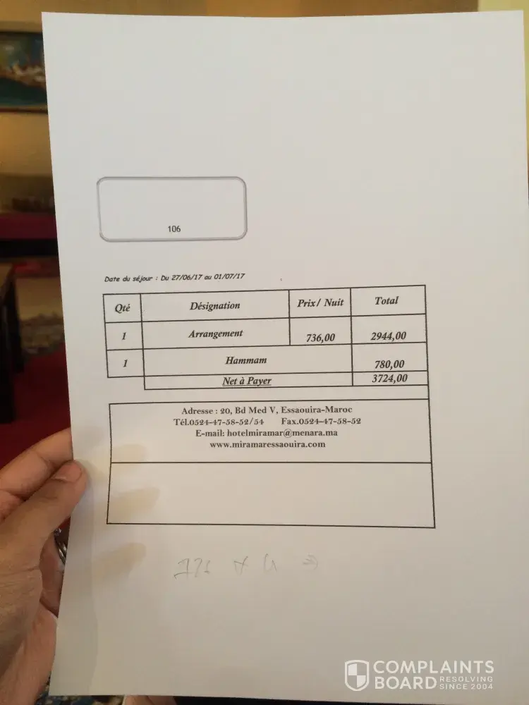 The next day, after further arguments with the hotel, it transpired that we had been booked at the wrong hotel - Hotel Miramar in Tangier. I had to phone Booking.com to cancel the hotel in Tangier, call lasted about 20 minutes and was charged £34.50. The hotel managed to provide us a room but at a higher rate of £59.21 per night.