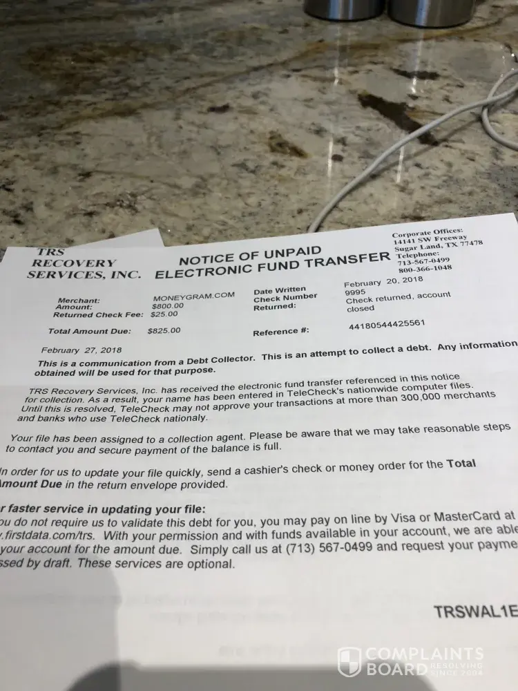 Sent me 3 letters of Unpaid Electronic Transfers and one of an unpaid canceled check on an Account I never had. Although the check did have my name and DL # on it. The signature was clearly not mine. Tried to call them about it and it was all robot and deflection to a website to dispute. On the said website they wanted info that a true collection agency would have such as Full Name and SSN. Called local LEO to file fraud and Identity theft. Was told by the officer that TRS is a scam and they were only Phishing.