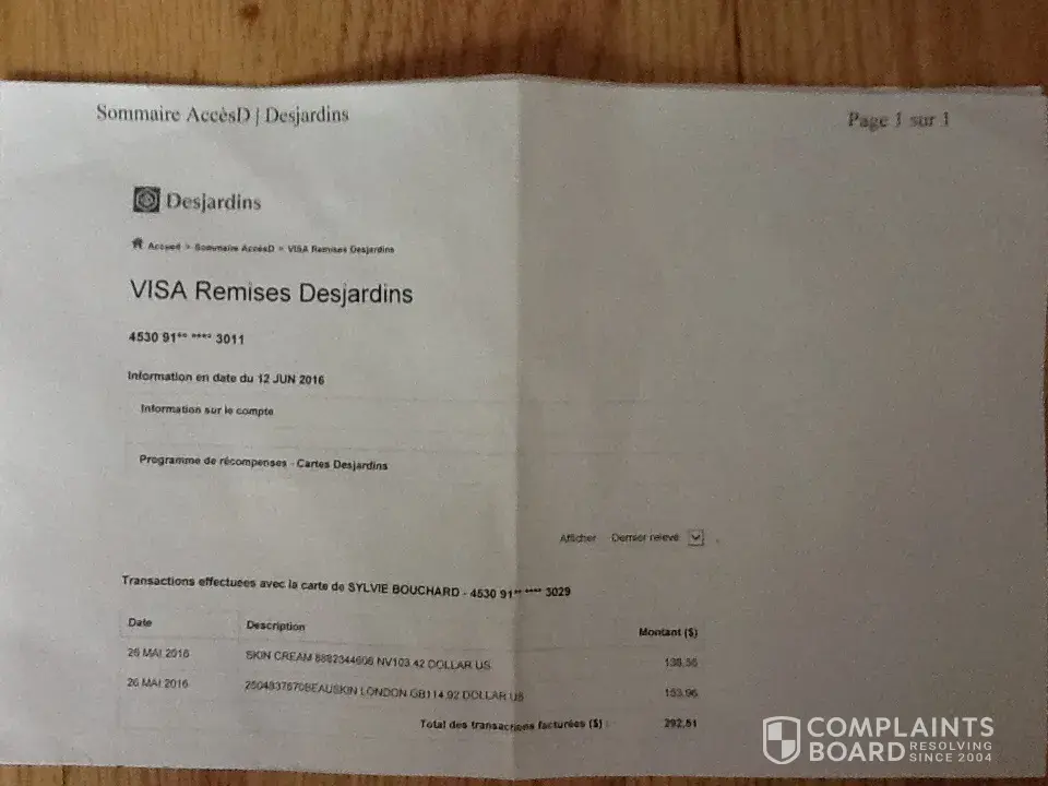 Bonjour, Je viens de constater que vous m'avez facturé un sérum et une crème que je n ai jamais commandé. Tout ce que je vous ai permis de pendre sur ma carte de crédit était les échantillons gratuits offerts sur internet pour un montant de 11.85$. Toutefois je m'attend A UN REMBOURSEMENT (JE N'AI JAMAIS DONNÉ L'AUTORISATION DE PRÉLEVER UN MONTANT DE 293.93$ SUR MA CARTE DE CRÉDIT) et je ne VEUX PLUS RECEVOIR AUCUN DE VOS PRODUITS. Vous pouvez m’appeler au numéro suivant;