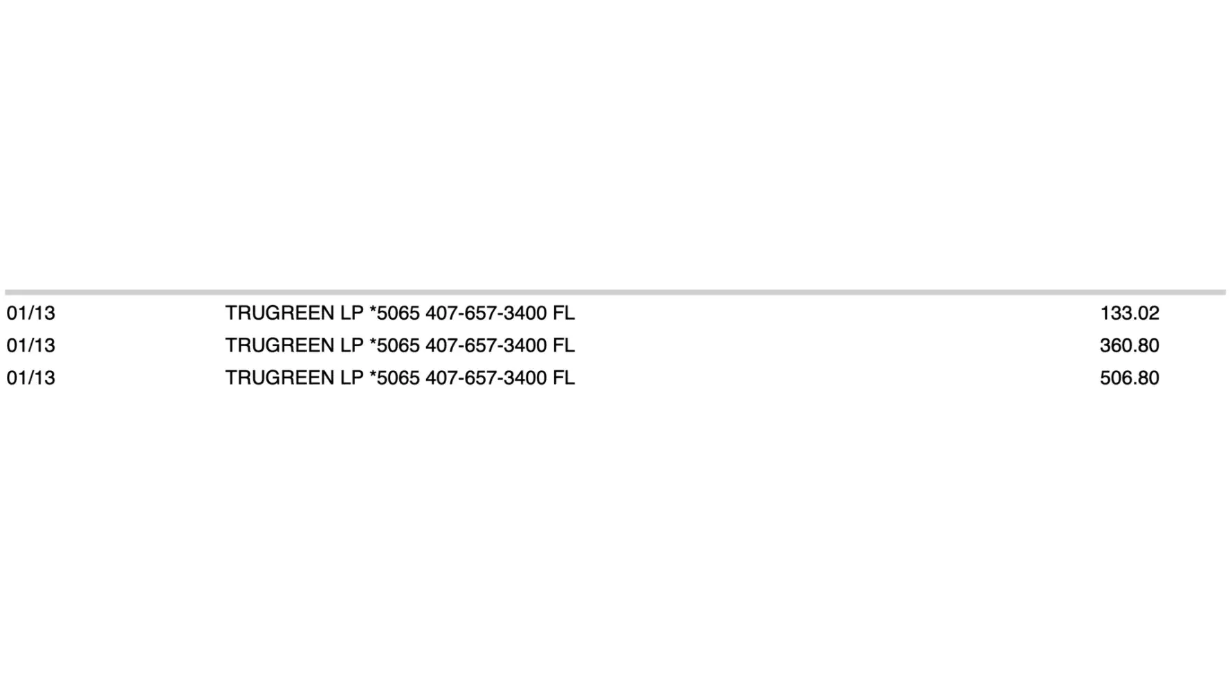 In January 2022 I pre-paid $1000.62 through 31 December 2022 for 3 services — TruHealth Lawn Service, Quarterly Perimeter Pest, and Annual Fireant treatment.