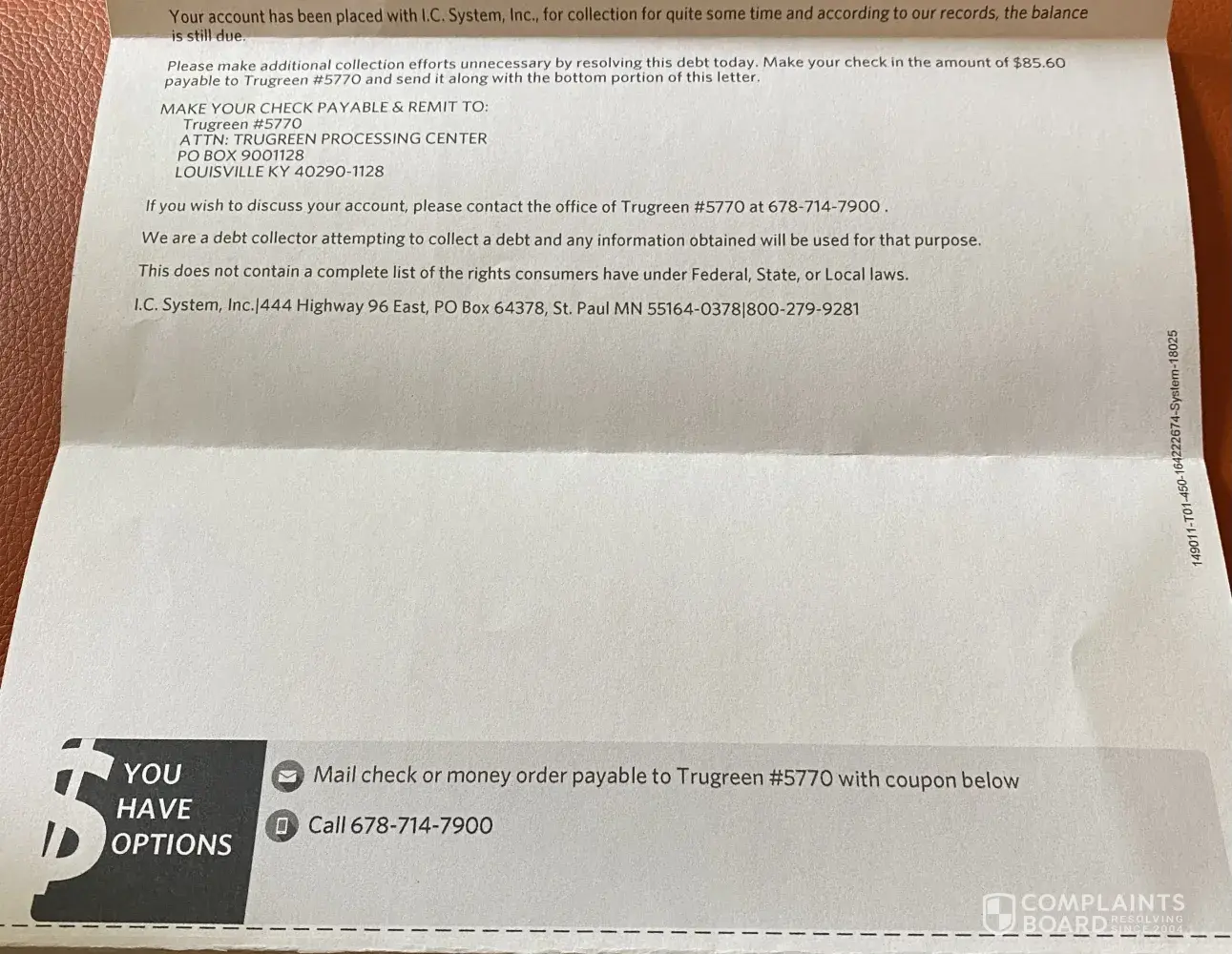 Desired outcome: No more bills be sent to us and this bill be waived. NEED A LETTER OF CLEARANCE FROM TRU-gREEN