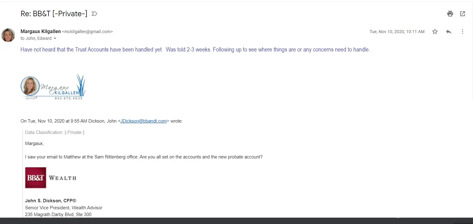As this transfer has taken over 9 months to complete it has cost the heirs and the Trust $17, 910.00 in higher fees than those charged by the receiving investment firms, $10, 442 this quarter alone.