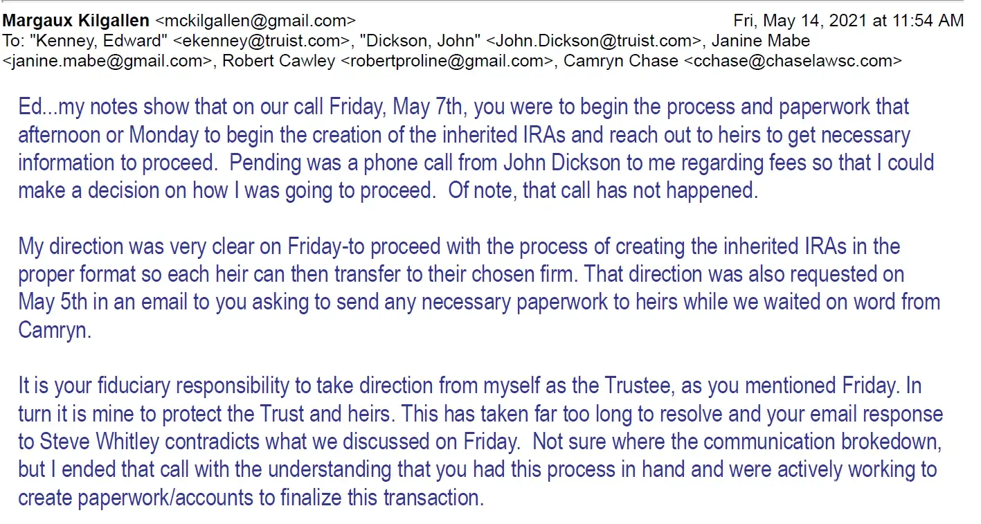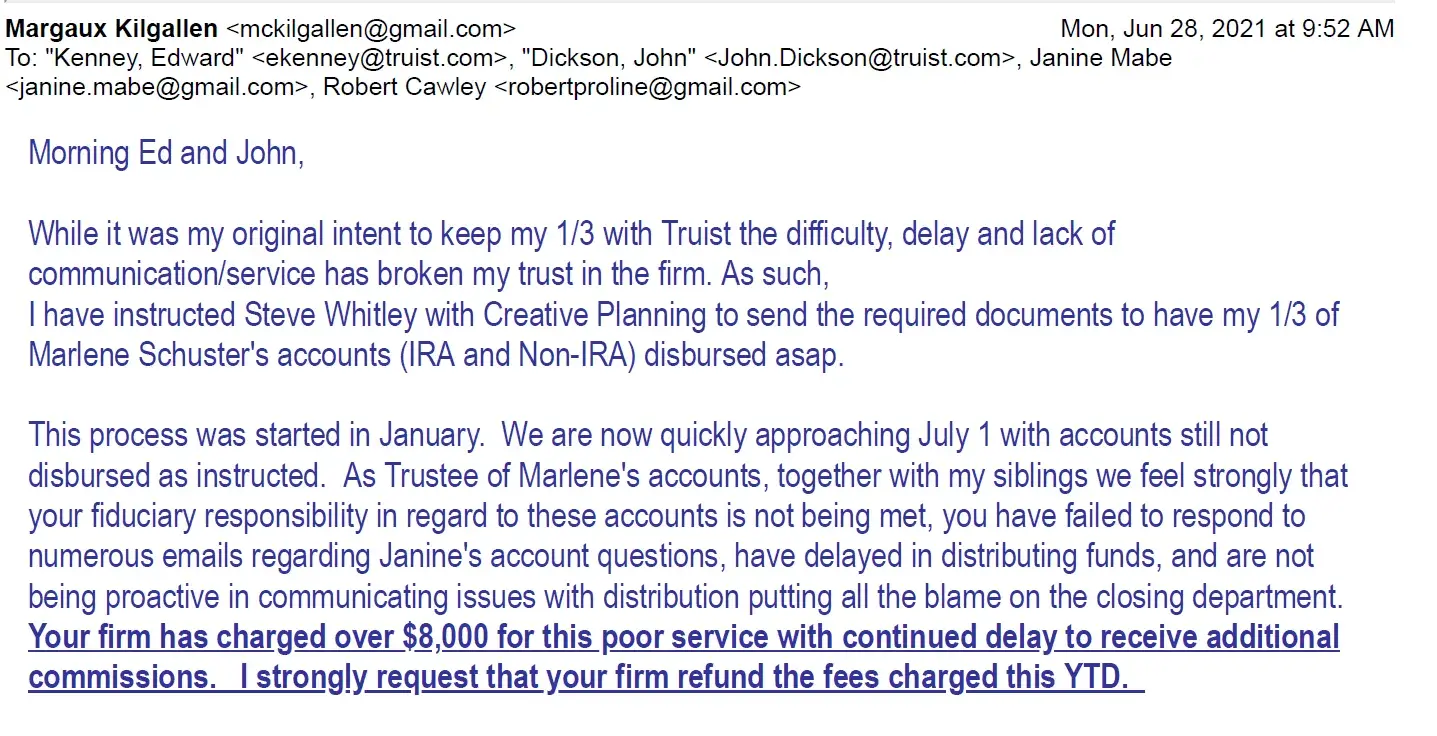 Have been trying since Jan 2021 to get 3 investment accounts transferred to a new firm. After multiple delays and miscommunication and advice by Ed Kenney requested file be turned over to someone higher up in wealth management division. Concerns were escalated to Sr VP Scott Lane on July 9, 2021 to help get transfers moving. Was told by Scott Lane that he would be directly responsible for my account in overseeing the timely transfer of funds and that he had an assistant that would help so should be no lack in communication. After numerous directives to finalize the distribution of funds, last being July 14, 2021 directly to Scott Lane, the final funds have still not been transferred. Was told via email that funds were to begin transferring on Sept 2, 2021. On Sept 21, 2021 learned that funds had not transferred. Mr. Lane responded after several emails that funds resumed transfer on 9/27/21. Sent follow up emails on 9/28 and 29, Mr. Lane responded on 10/1 that all had been transferred. Inquired 10/5/21 as no funds received and Mr. Lane replied funds started transferring again on 10/4/21. Truist has a fiduciary responsibility to perform in a timely manner in regard to directives regarding disbursement of stocks and bonds; and to communicate in a timely and effective manner. As this account had to be escalated to Mr. Lane with the clear understanding that time is of the essence, it is unfathomable that I am still having to have the new investment firm and heirs reach out to Mr. Lane in order for there to be an action on the part of Truist in facilitating the transfer of funds.