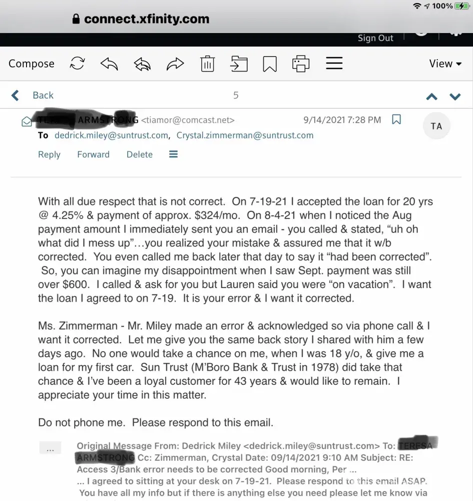 I called BB&T/ Suntrust in Atlanta [protected]). They listen and said a Mr. Garcia was to call me back. He never did.