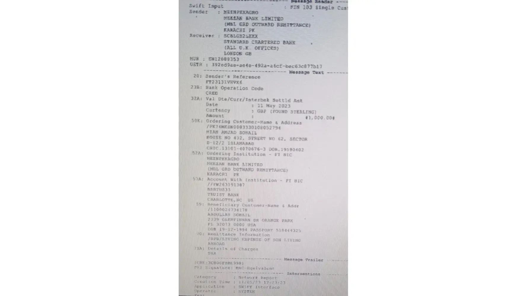 I had a wire transfer of £1000 coming from Meezan Bank Pakistan to my Truist bank.The intermediate bank for the transaction was Standard Chartered Bank UK. It has been sent on 11th May 2023 and I haven't received the funds till yet.