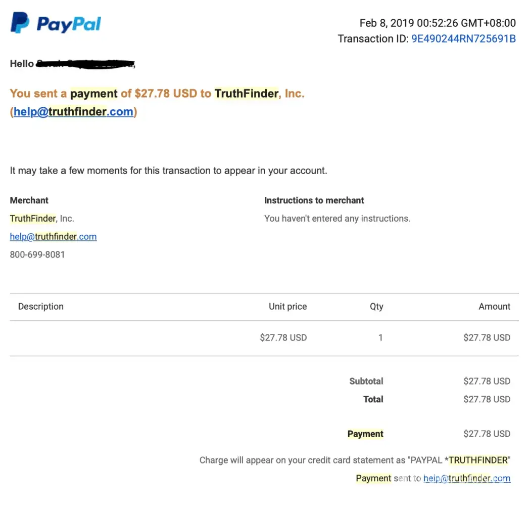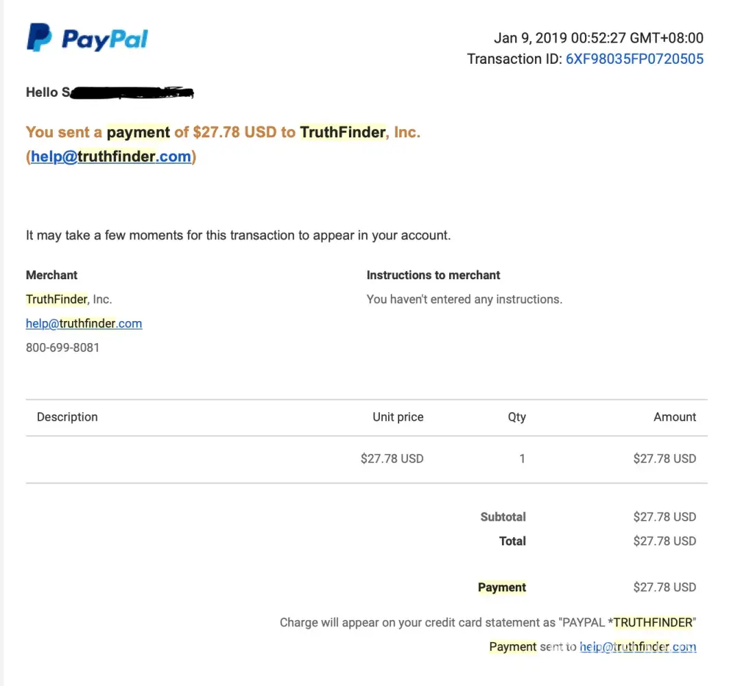 I have not personally used the application for any sort of Investigation or information gathering to be clear, this reviee soley focus's on my experience with there support team. somebody did use my card to access the website for information apparently at some point or another. Idk how transactions are processed or applied, but upon noticing a unauthorized transaction on my account history or 30$roughly, I was very angry and sent a very direct message that could have easily been taken offensively or as hostile. I was furious at the time. But truthfinder did the unthinkable, they received, and quickly reviewed my request to get a refund for the money. And without protest, they issued a refund. so instead of angrily switching banks, and cancelling ***, I ordered a new bank card and changed *** security info. While things happen, and nowere truly can guarantee 100 percent online or fraud protection in the world we currently live in, I would have cancelled it all if this would have taken any effort to obtain what belonged to me. So they have actually earned my respect as well as a potential future customer and positive Word of Mouth and saved bank and paypal relations. In regards to my personal experience with this company, I however have no insite into the effectiveness of the actual service they offer. My experience with the customer service side has obviously, in my personal experience, been above and beyond so big thanks to you true finder security and support team I'll never have a bad thing to say about you. "
