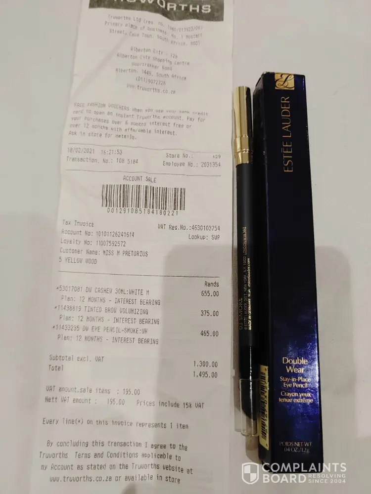 Went to alberton truworths today. After buying clothing I went to the cosmetic section. I needed a foundation. Went for estee lauder as that's my choice. However there were no testers whatsoever. A security guard (omg) had to come and assist me in choosing a colour, whilst the lazy sales person sat on her privileged backside behind the counter, offering no assistance at all. Not even sure if I got the correct colour in the foundation. I then went to get mascara and an eye pencil. Getting home to my complete dismay, I find that the eye pencil has either been used or estee lauder is up to [censored] as this thing is almost half, the mascara is dry and seems empty, I noticed fingerprints on the damn bottle. Was this used and sold to consumers? And why the hell are these thing not wrapped in plastic. I spent almost r1500 on estee lauder products today and am totally disappointed and disgusted in both the service and the products. I demand an answer as to what happened to the protective plastic over the products. Covid is around and this is what truworths and estee lauder practices...
