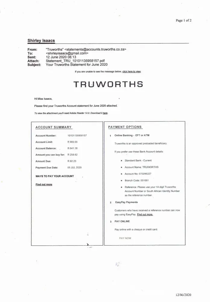 Due to this pandemic, as a customer I was frustrated as the truworths stores were closed and knowing that I have an account that has to be paid made an effort to pay my account on line. I used my name as reference number instead of the id number or account number as the store requires. After realizing my account is not updated when I received a reminder for payment, I contacted truworths and was given an email to forward proof of payment - which I did. On the 11th was called again and I forwarded the info. And they are calling everytime and this is really not good. Please let the team consolidate their info after receiving it. [protected]@truworths.co.za, [protected]@truworths.co.za and others are the addresses that were given to me.