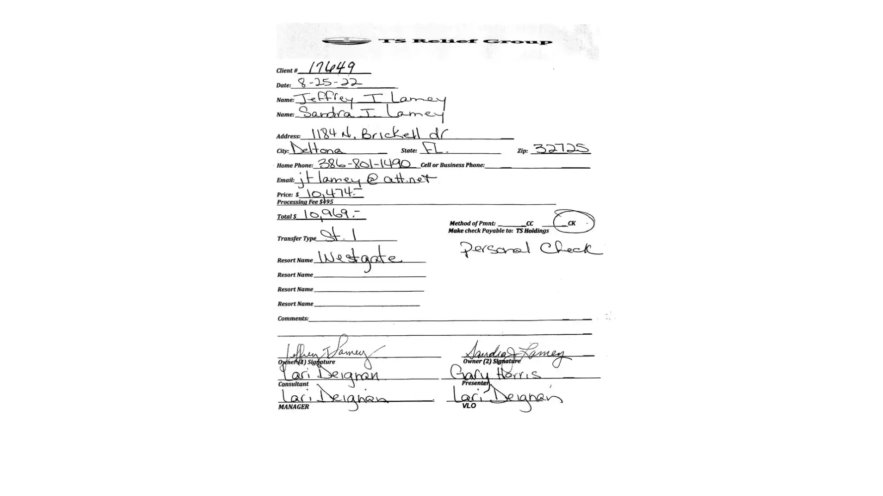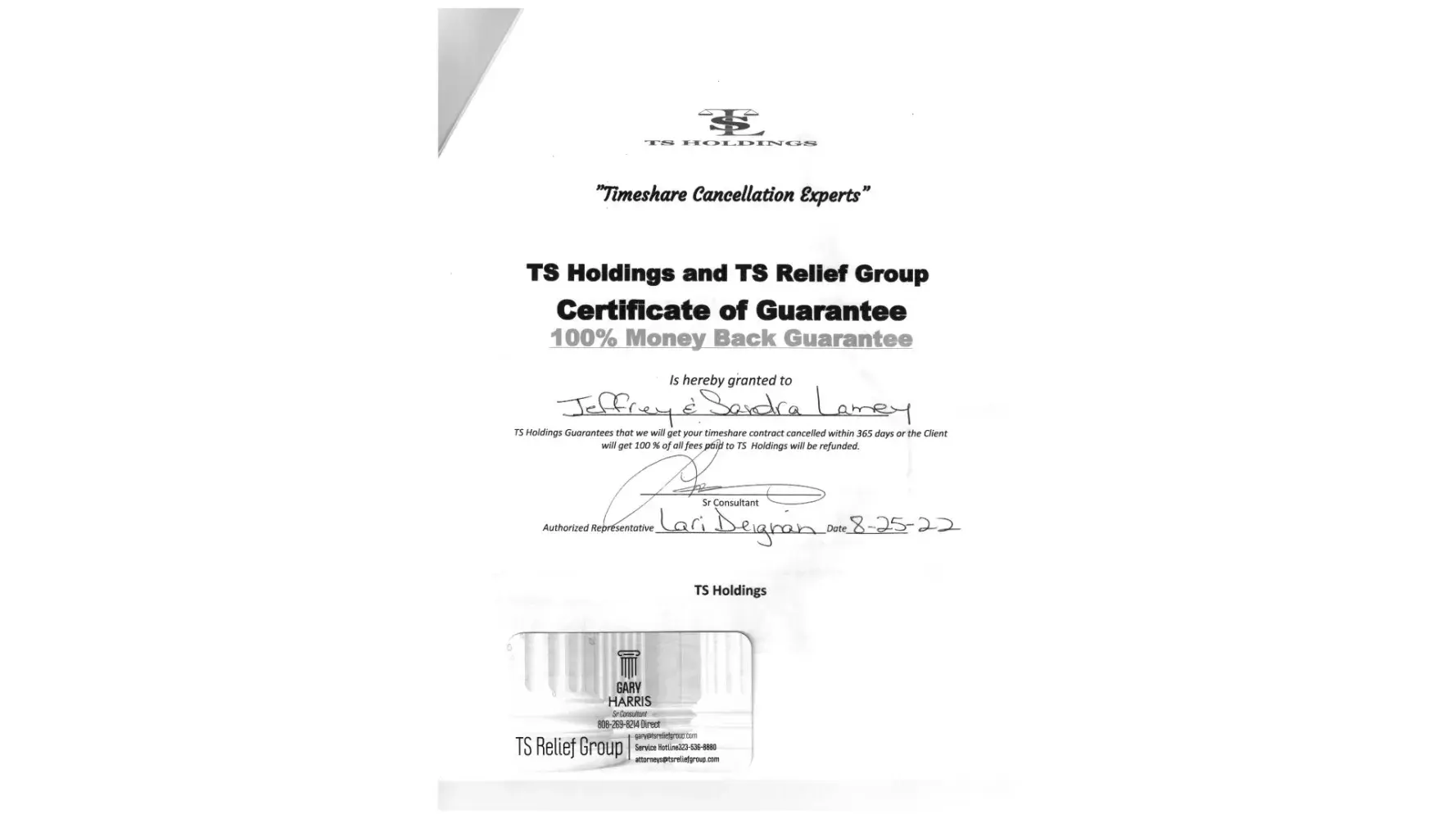 On 25 August 2022, after attending an invitation, we submitted a $10,969 check for TS Relief Group to assume the duties of releasing my wife and I from our Westgate ownership with a 100% guarantee refund if unsuccessful within 365 days.