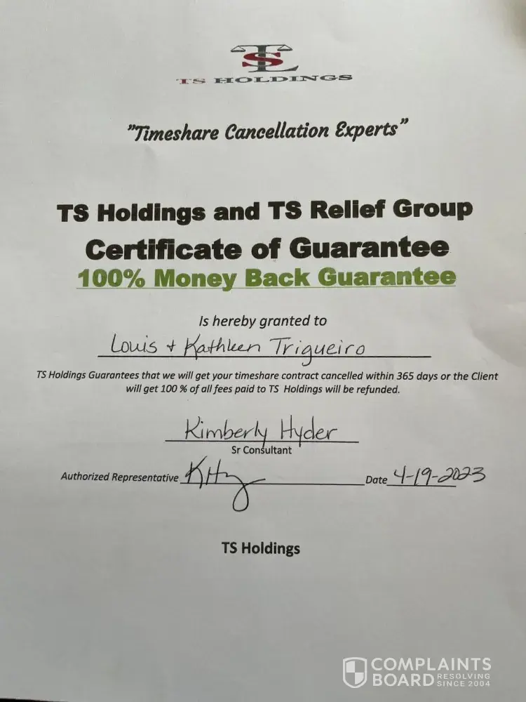 On 29 June 2023, I received from Westgate Resorts Legal department a letter advising due to legal errors the “recorded†Quitclaim deed by TS Relief Group on behalf of Paradise Point I, LLC was null and void (as also recorded in Orange County FL court records). A phone conversation with Westgate has revealed due to “Right of First Refusal†they will not honor the attempt by TS Relief Group to obtain the timeshare unit for a third party. Therefore, according to the 100% guarantee, a full refund of $10,969 is warranted and legally binding.