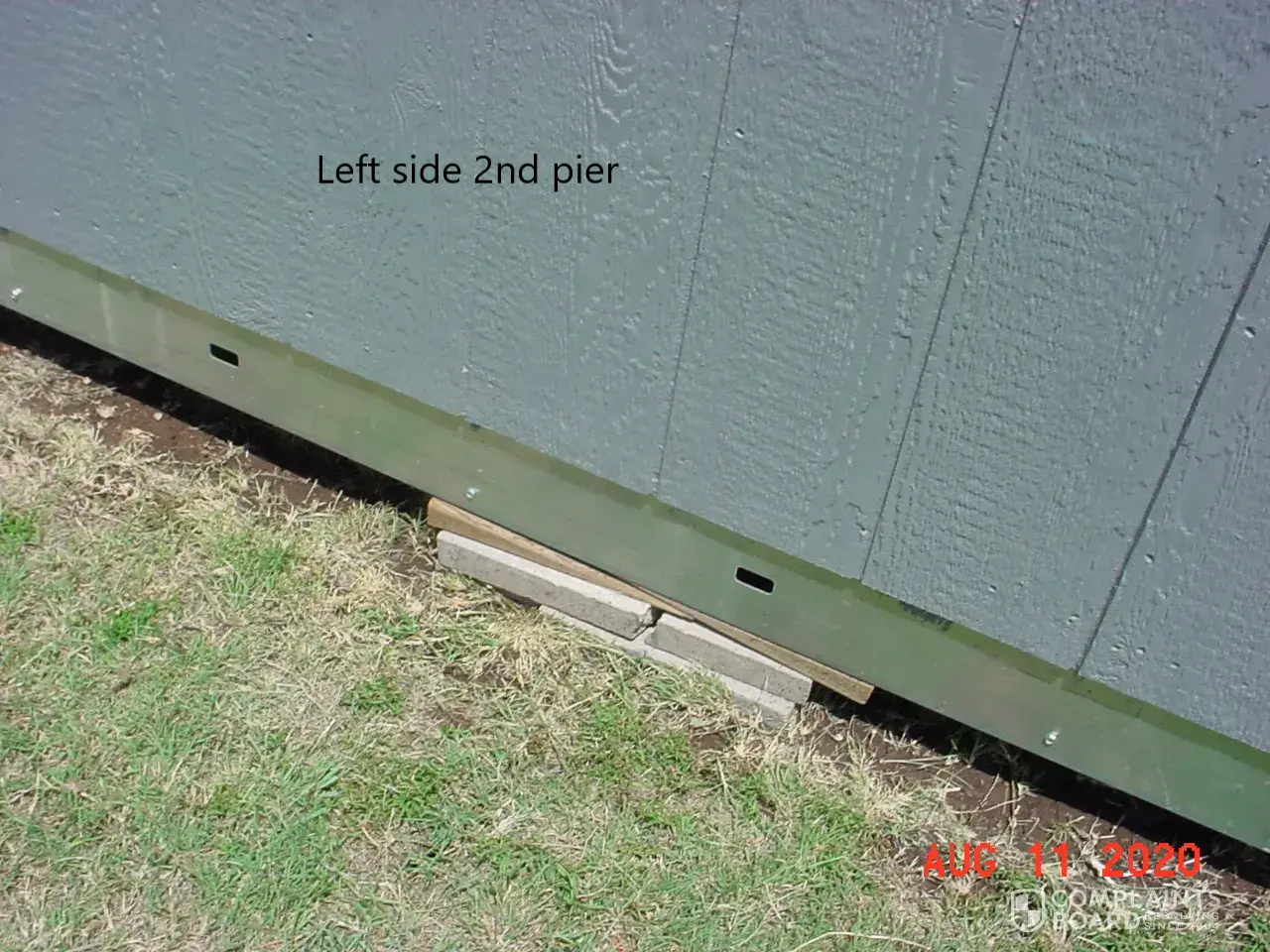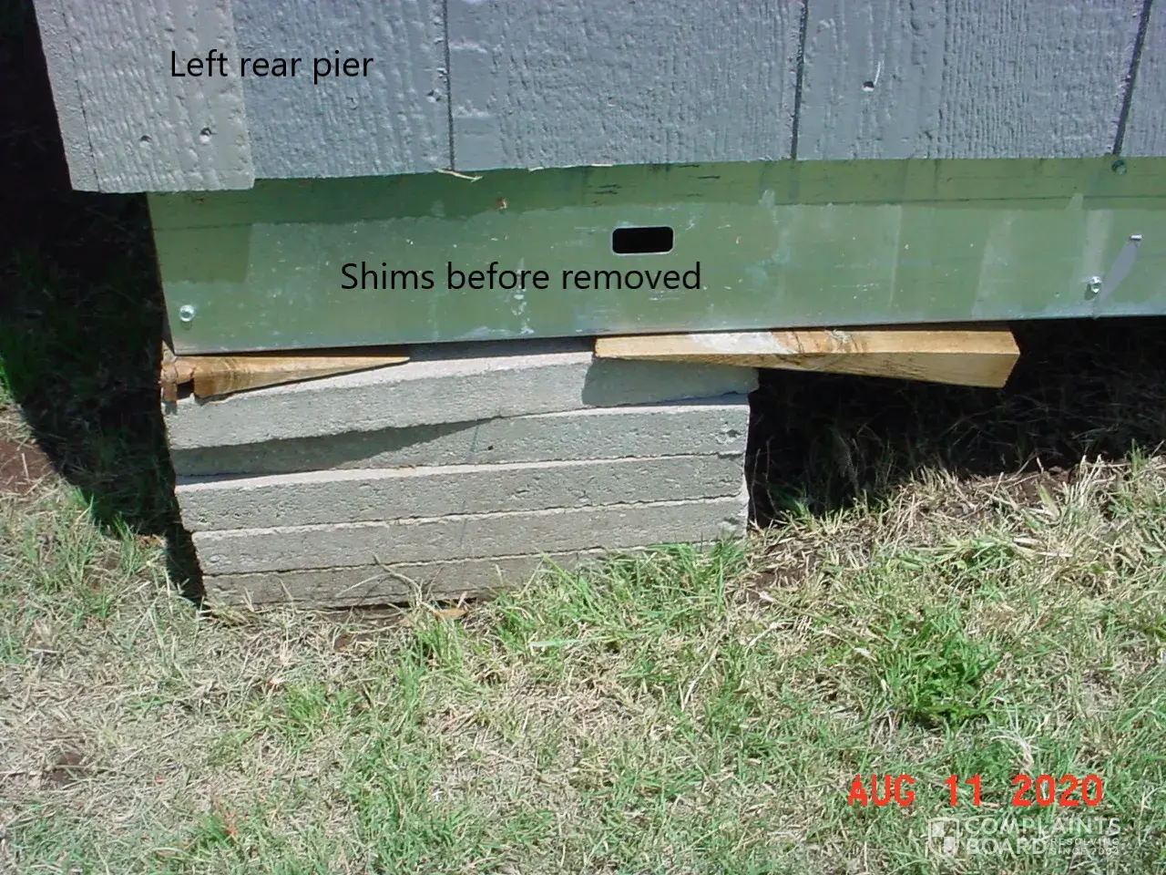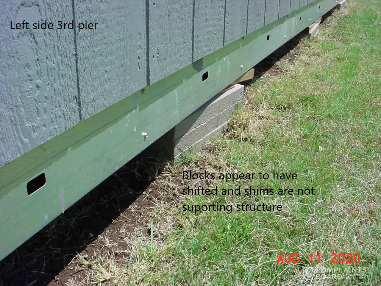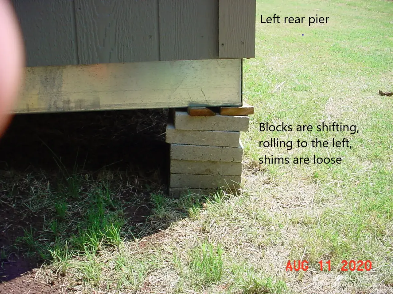 Concrete pad stacks are rolling to the right, some of the blocks are broken, some are not supporting the building, the entire building appears to be shifting to the right. shims have not been installed properly, shims are coming loose, some are not supporting the building at all, the door drip edge is pulling away from wall, the belly trim above door is pulling away from wall. All support pads were installed inline with outside of rim joists but either they have moved or the building has.