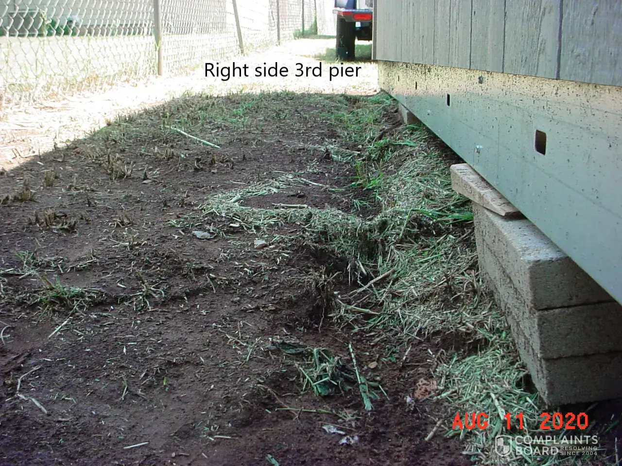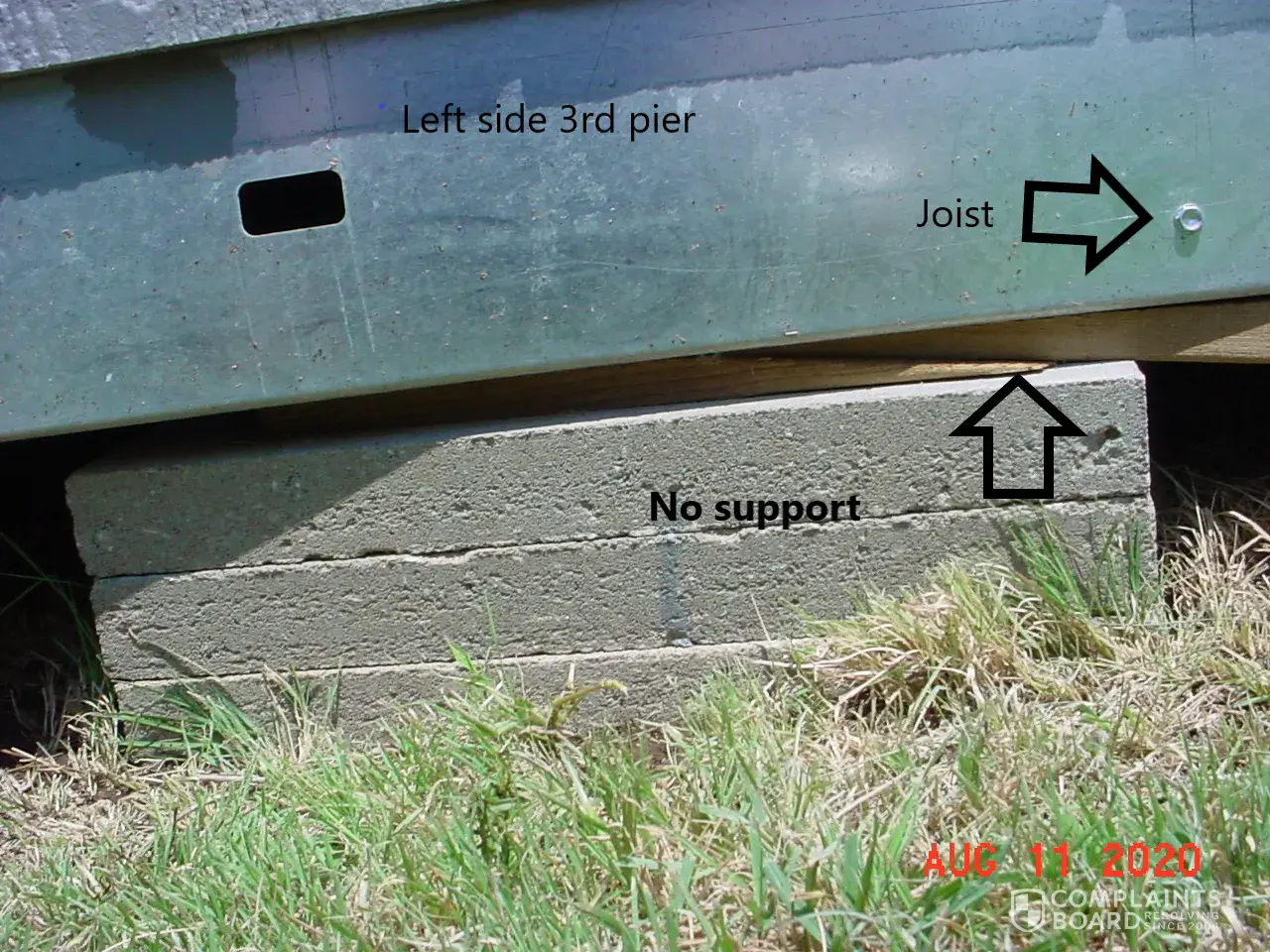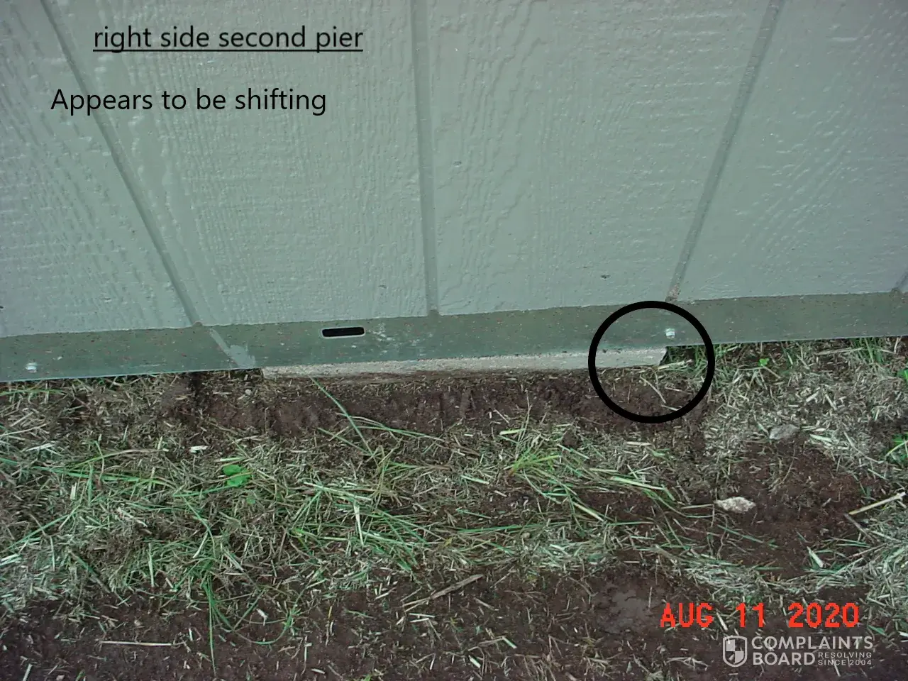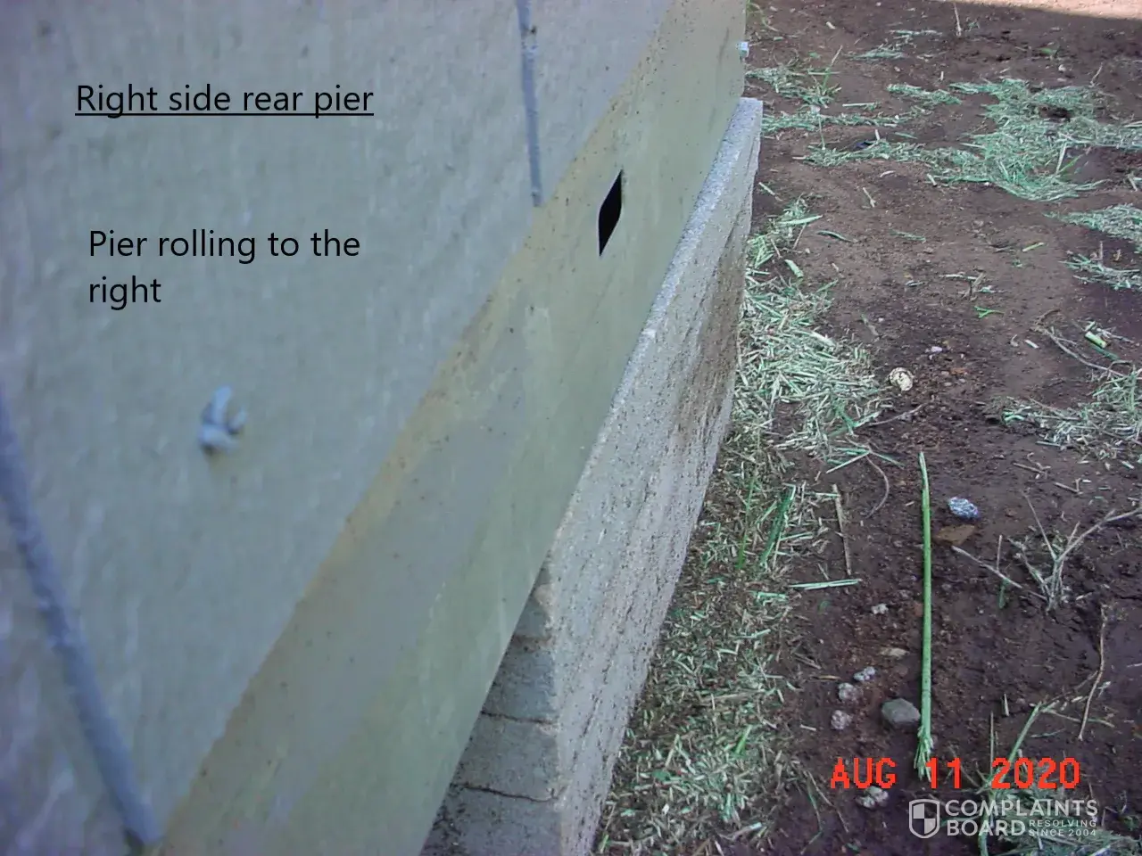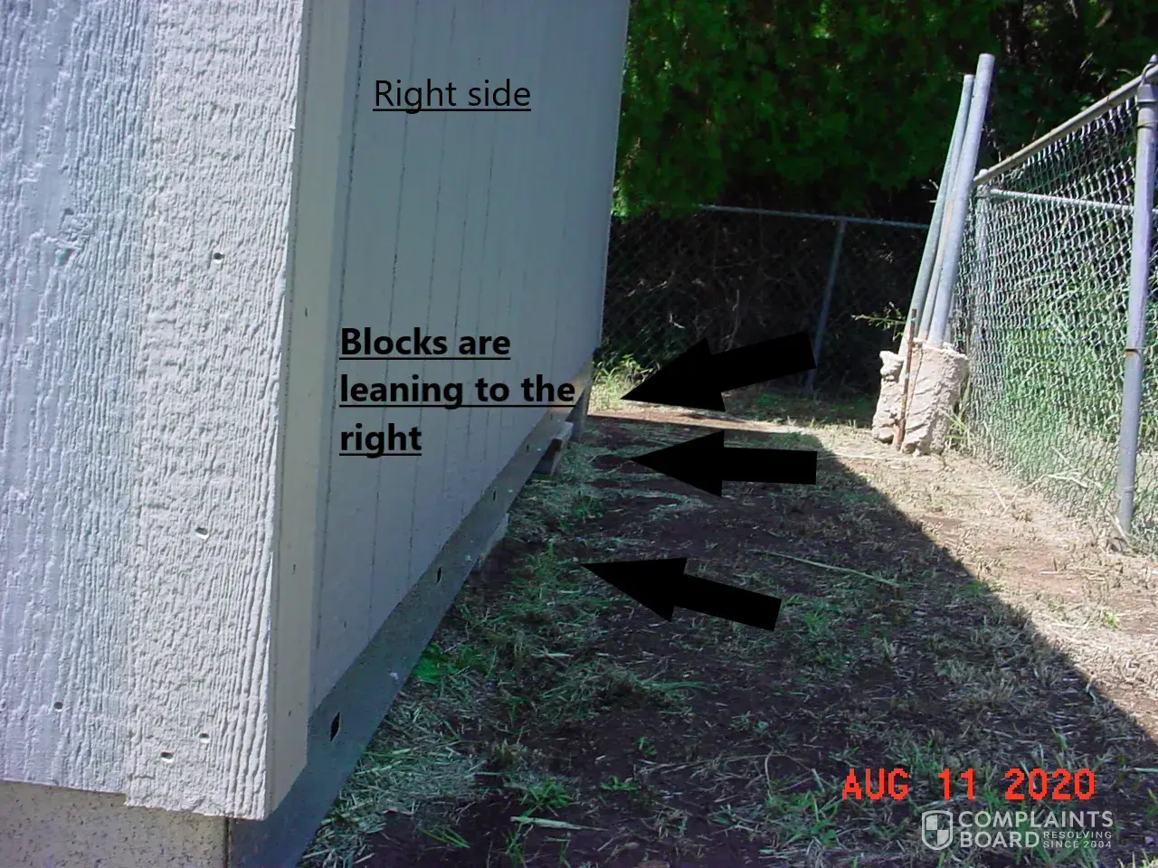 Concrete pad stacks are rolling to the right, some of the blocks are broken, some are not supporting the building, the entire building appears to be shifting to the right. shims have not been installed properly, shims are coming loose, some are not supporting the building at all, the door drip edge is pulling away from wall, the belly trim above door is pulling away from wall. All support pads were installed inline with outside of rim joists but either they have moved or the building has.