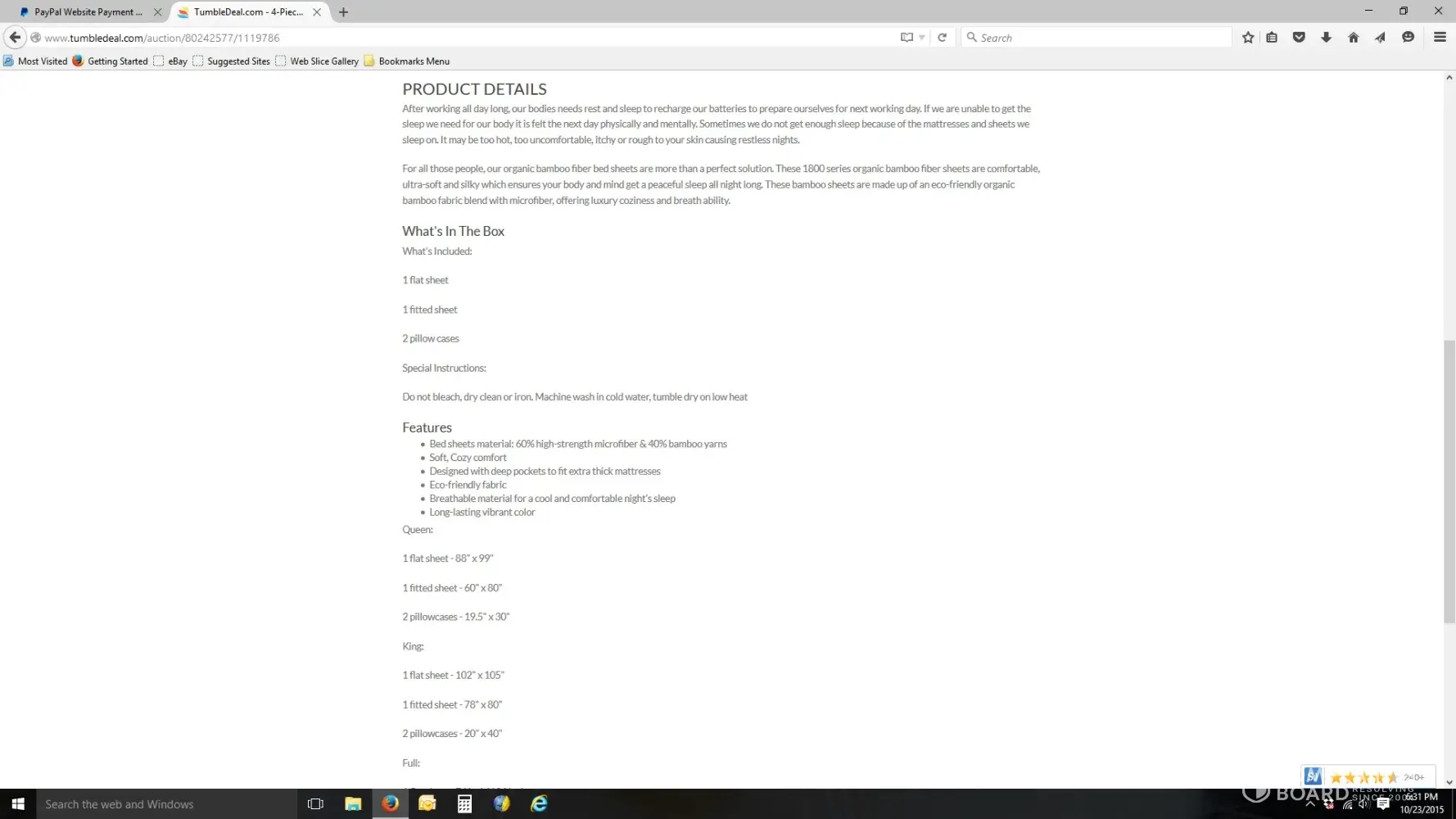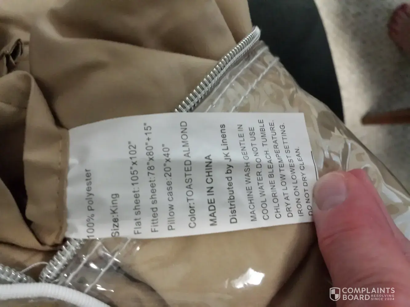 We ordered a "bamboo" sheet set on Tumbledeal that was advertised as organic bamboo, 60% microfiber, 40% bamboo. Yet when we received the sheets the care label clearly read 100% polyester. And, the brand label on the package was different from the brand label on the sheets. DO NOT BUY from Tumbledeal. It is clear they are crooks. My credit card company already performed a charge back transaction.